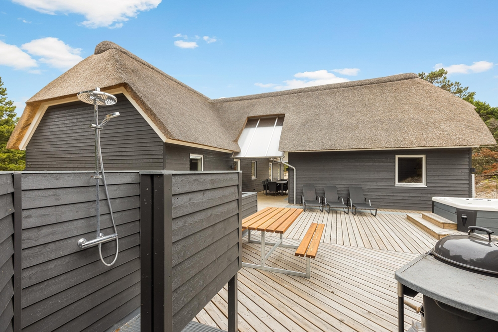 Am Abend könnt ihr ein leckeres BBQ veranstalten und sitzt auch hierbei, dank der teilweisen Überdachung, gut geschützt. Oder ihr nutzt eure ganz eigene Wellnessabteilung ? macht einen Saunagang, erfrischt euch mit Hilfe der Außendusche und genießt den Blick in den Sternenhimmel, während ihr im sprudelnden Wasser des Whirlpools sitzt. (Die Außendusche kan von April bis November genutzt werden).