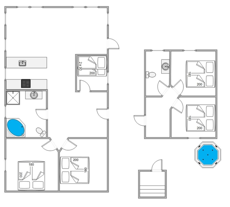 Die Wohn- und Schlafbereiche, sowie die Badezimmer sind mit einer Fußbodenheizung ausgestattet und zusätzlich könnt ihr die energiesparende Wärmepumpe zum Heizen nutzen. Die Aufteilung in Haupt- und Nebenhaus ist besonders für 2 Familien praktisch. Im Haupthaus findet ihr ein Badezimmer mit Whirlpool und Dusche, 2 Schlafzimmer mit Doppelbetten, sowie ein Schlafzimmer mit Etagenbett.