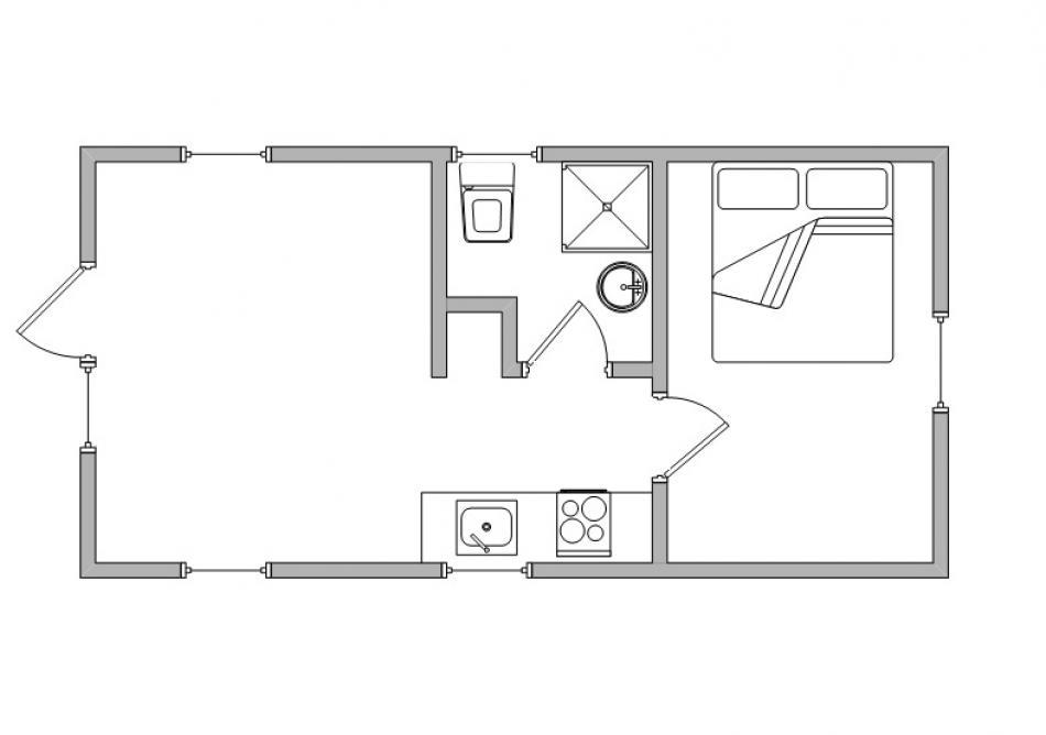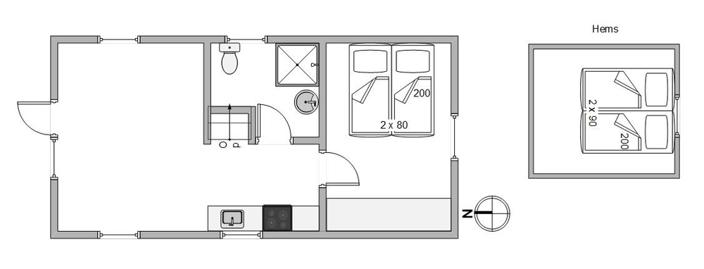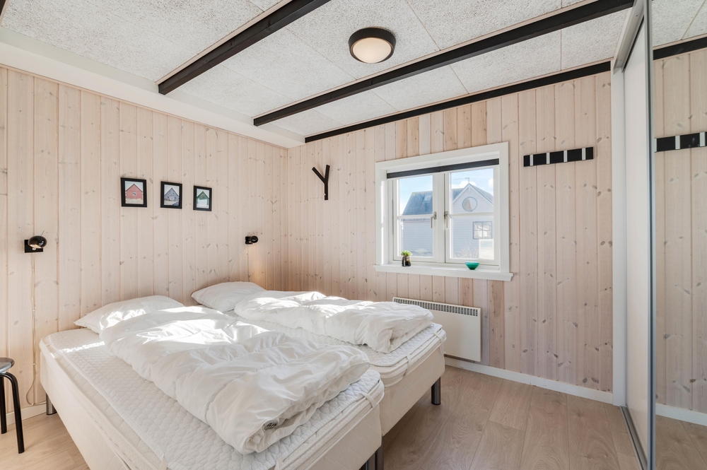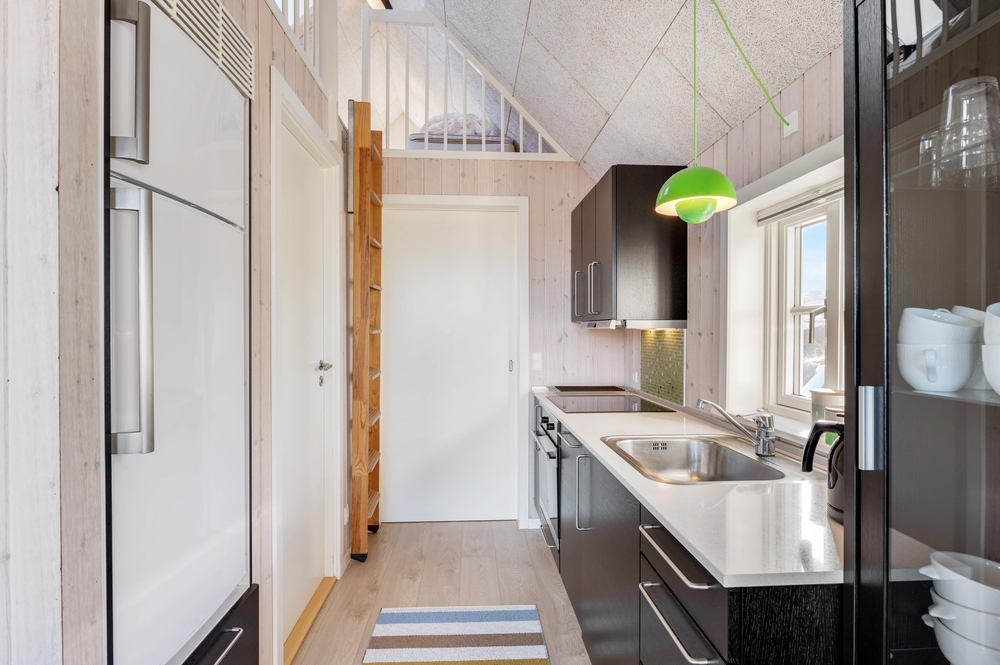 Hier ist Platz für 4 Personen. Die Hütte besteht aus einem schönen Schlafzimmer mit Doppelbett und Schränken, schickem Badezimmer mit Dusche und einer gemütlichen Wohnküche. Die Küche ist mit allen Bequemlichkeiten eingerichtet, z.B. Induktionskochplatten und Geschirrspüler.