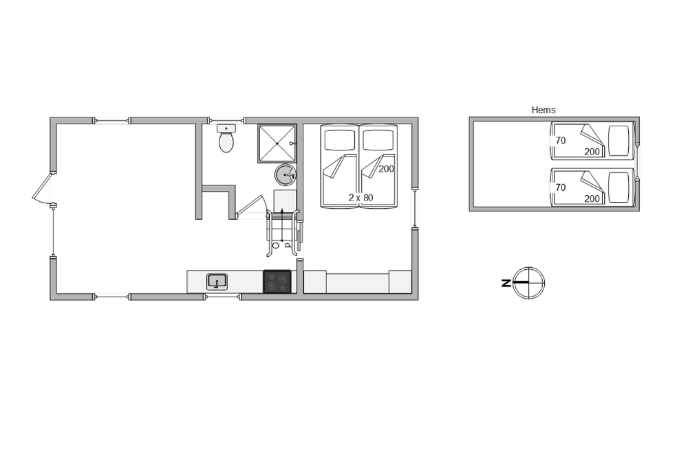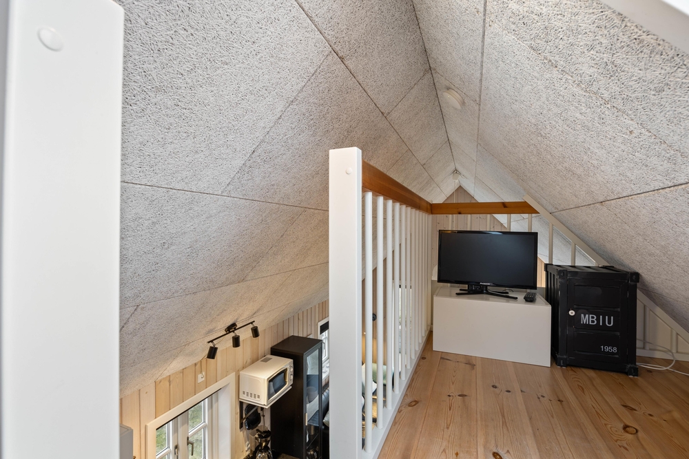 Das gemütliche Wohnzimmer ist offen mit der Küche verbunden, von hier habt Ihr Zugang zum Schlafboden (Hems) mit 2 Schlafplätzen und TV für mitgebrachte DVD-Player, Palystation oder ähnliches. Das Wohnzimmer ist ausgestattet mit einem Flachbildschirm-Fernseher, ebenso ist gratis W-LAN Interet vorhanden. Die Hütte wird mit einer energiesparenden Wärmepumpe aufgewärmt.