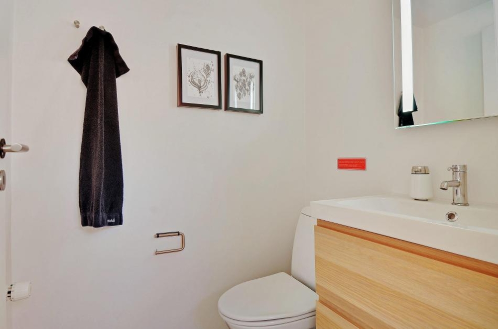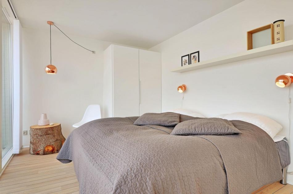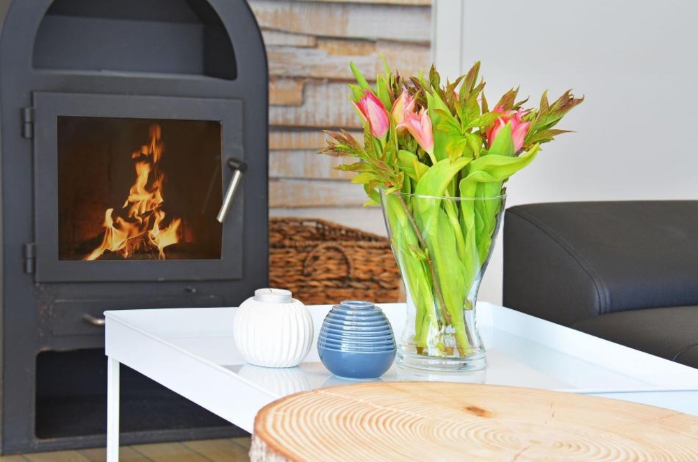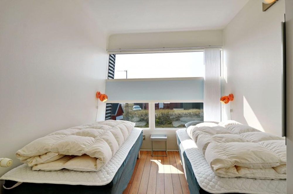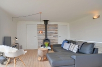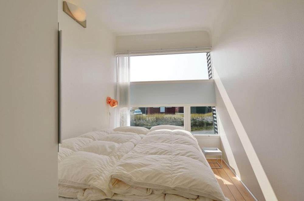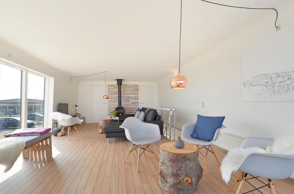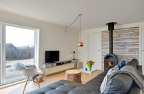 Oben gibt es noch zwei Schlafräume und das geräumige und gemütliche Wohnzimmer, wo du abends den Kaminofen und Kerzen anmachen und einfach die Aussicht über den Fjord genießen kannst.