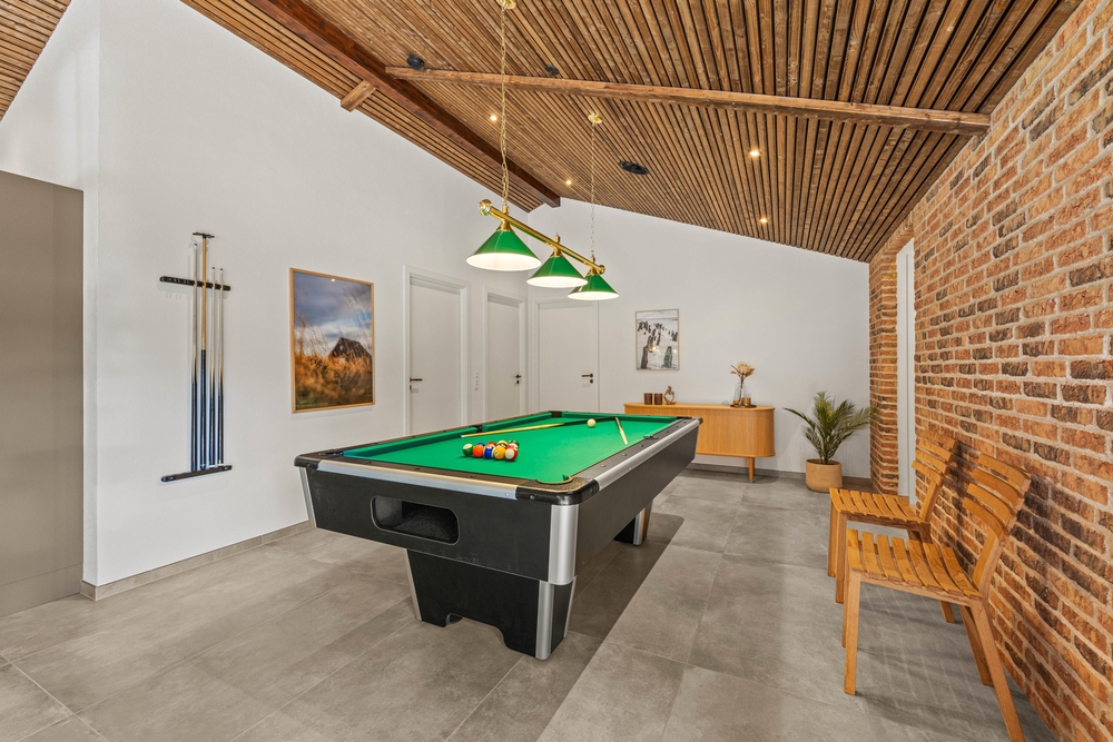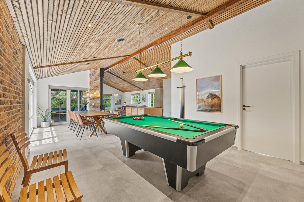 Der offene Grundriss des Wohnbereichs mit den hohen ausgebauten Decken, versprechen eine schöne gemeinsame und gesellige Ferienzeit. An dem langen Esstisch könnt ihr nicht nur gemeinsam Essen, hier kann auch mal gespielt oder gebastelt werden. Zum Dessert gibt?s dann eine Partie Poolbillard. Oder ihr spielt darum, wer den Tisch abräumt. Gemütlich wird es auf der großen Sofalandschaft oder den bequemen Sesseln. Genießt gemeinsam das Knistern des Feuers im Kaminofen, oder schaut gemeinsam einen spannenden Film auf den Flat TV.