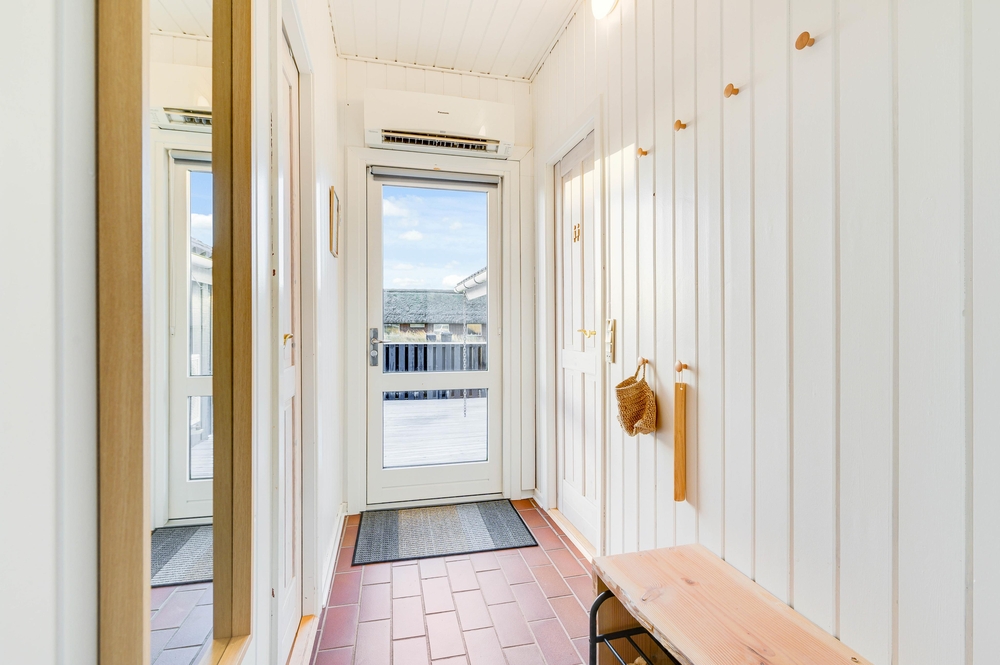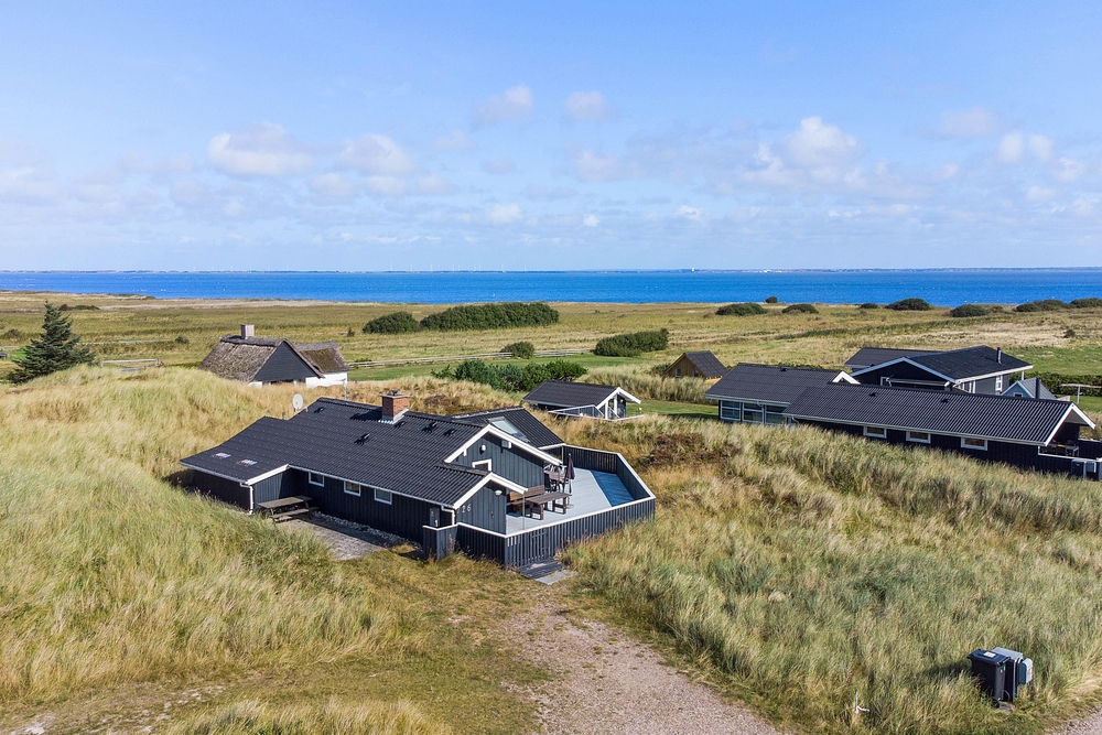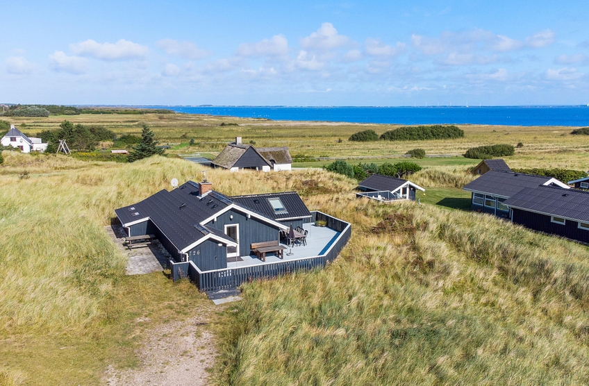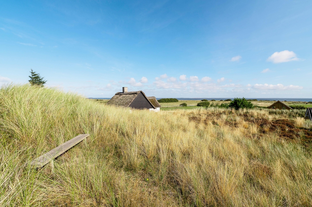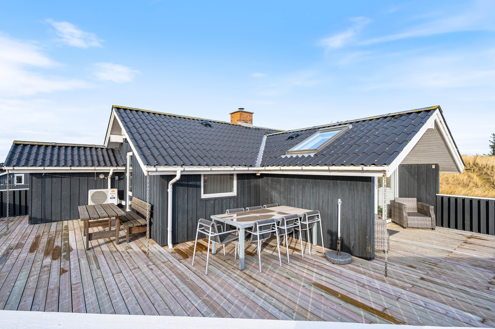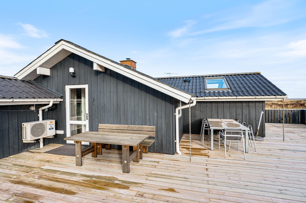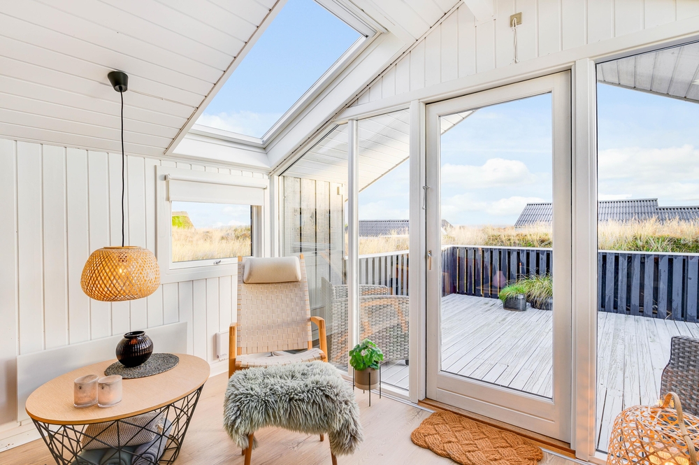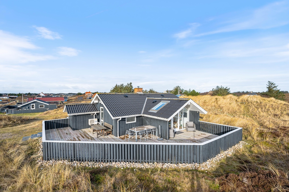 Der Außenbereich eures Ferienhauses bietet eine teils überdachte als auch geschlossene Terrasse. An sonnigen Tagen lädt diese gerade dazu ein, sich auf den Gartenmöbeln niederzulassen, eine Tasse Kaffee oder ein kühles Getränk zu genießen und der Natur der Westküste Dänemarks zu lauschen. Selbst den Ringköbing Fjord könnt ihr von hieraus sehen.