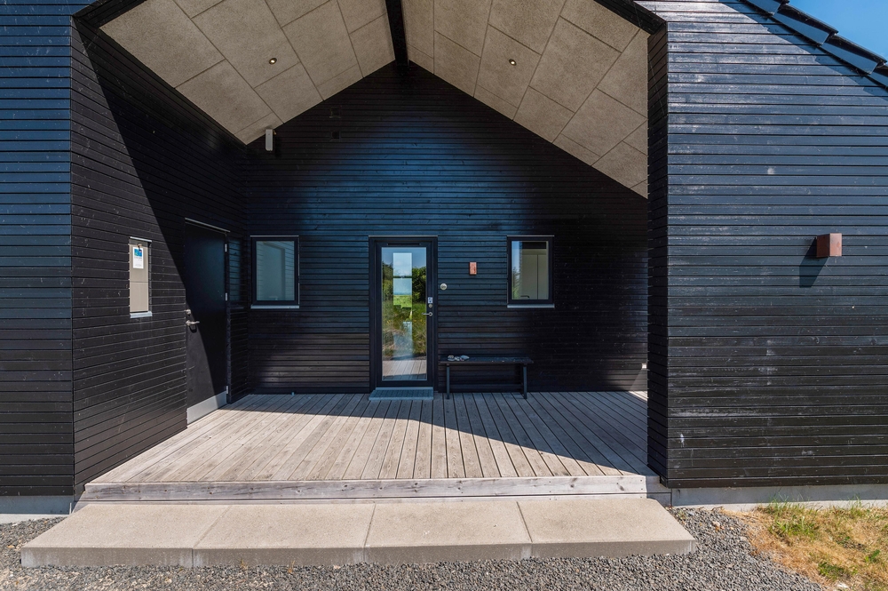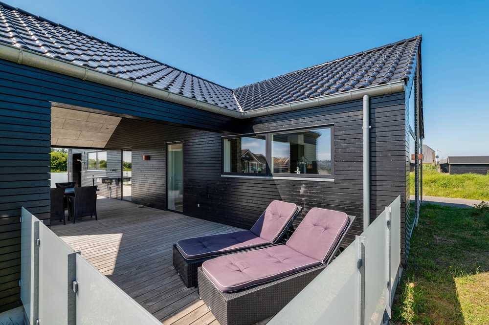 Auf der schönen Holzterrasse des Hauses, die nach Süden ausgerichtet ist, habt ihr die Möglichkeit, die frische Luft und das schöne Naturgrundstück zu genießen. Die Terrasse ist sowohl teilweise überdacht als auch vollständig überdacht, sodass für jeden Geschmack etwas dabei ist. Macht es euch in den Gartenmöbeln bequem und genießt den Blick zum Ringkøbing Fjord. Zusätzlich gibt es eine Außendusche und eine kleine Reinigungsstation auf der Terrasse.