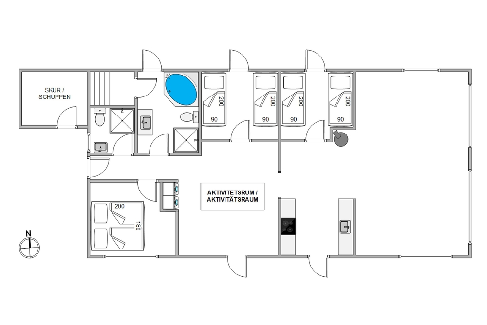 Das Herzstück des Ferienhauses ist der offene Wohnbereich, welcher Küche, Essbereich und Wohnzimmer zu einem großen Gemeinschaftsraum vereint. Hier könnt ihr viele schöne Urlaubsmomente genießen ? der knisternde Holzofen sorgt hier immer für wohlige Wärme und gemütliche Urlaubsstimmung. Angrenzend an das Wohnzimmer befindet sich der Aktivitätsraum, in dem ihr euch gegenseitig zu einer Partie Tischkicker herausfordern könnt.