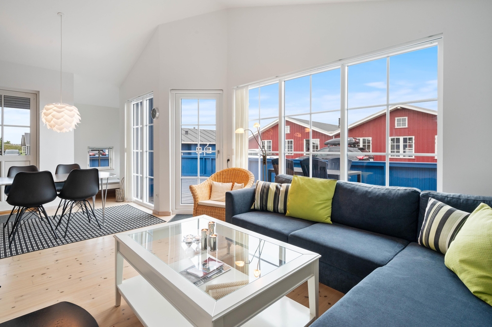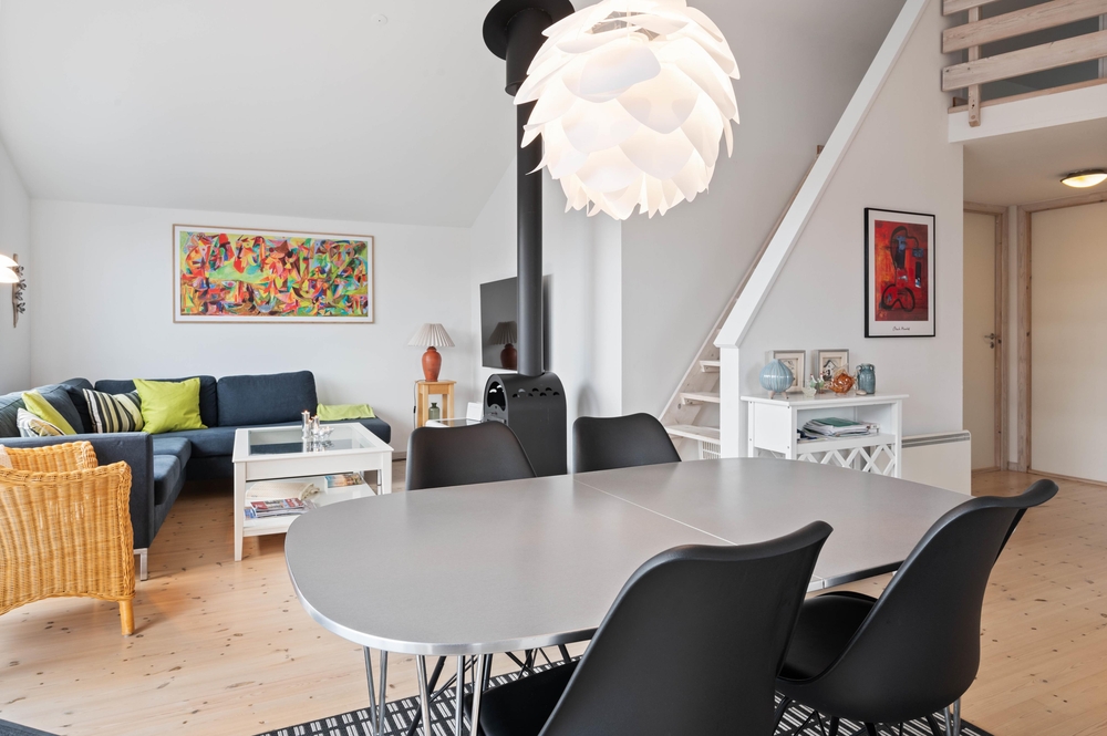 Der Wohnbereich bildet den Mittelpunkt des Ferienhauses und ist ein gemütlicher Ort für viele entspannte Stunden. Ob bei einem guten Film im Fernsehen oder bei einem leckeren Essen und Spieleabend. Gleichzeitig könnt ihr das urige Knistern des Holzofens genießen und die typische Ferienhausatmosphäre in Dänemark erleben.