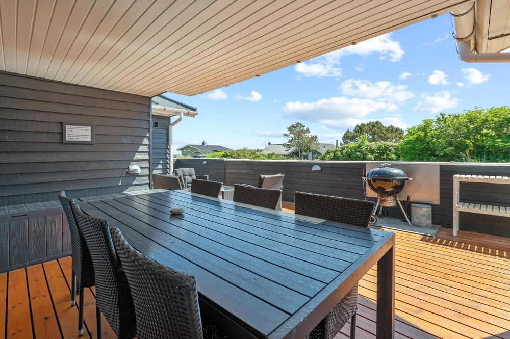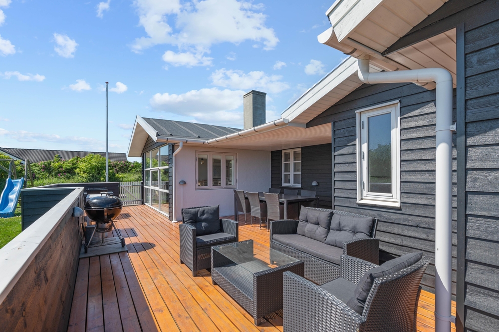 Ein Teil der geschlossenen Terrasse lädt mit seiner Überdachung zu geselligen Runden am Abend ein. Wunderbar wind- und wettergeschützt könnt ihr mit einem guten Essen vom Grill viele Stunden unter freiem Himmel, an der frischen Luft verbringen. Gartenmöbel, Liegestühle und ein Grill sind selbstverständlich vorhanden.