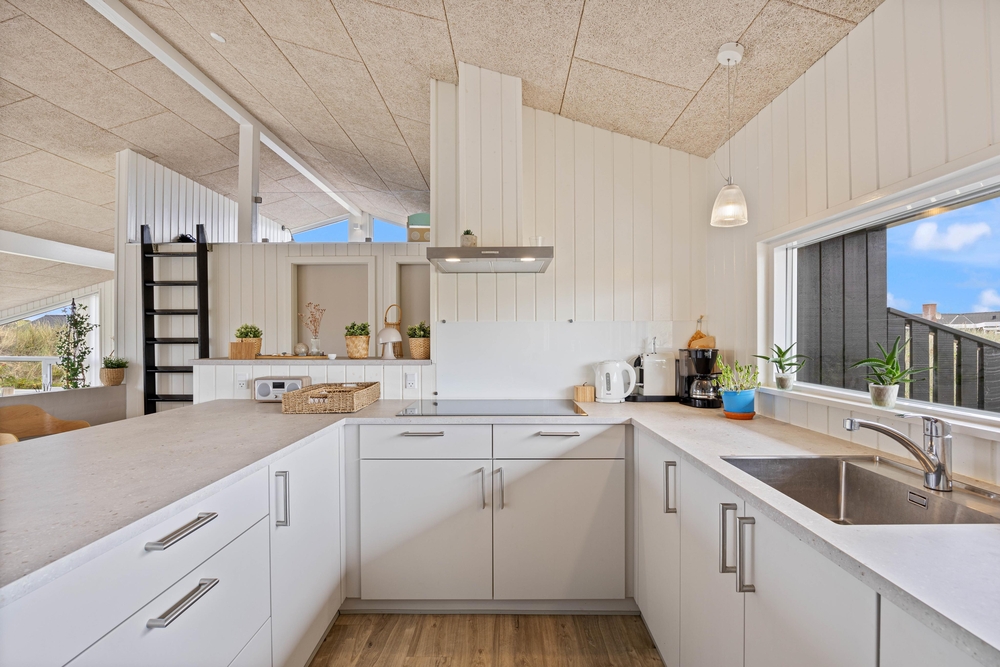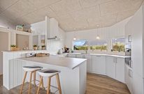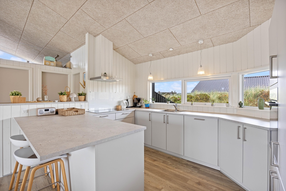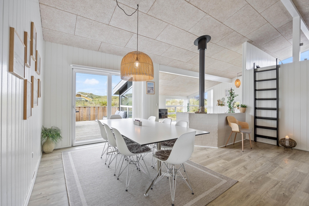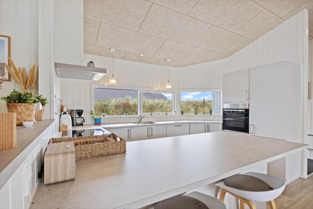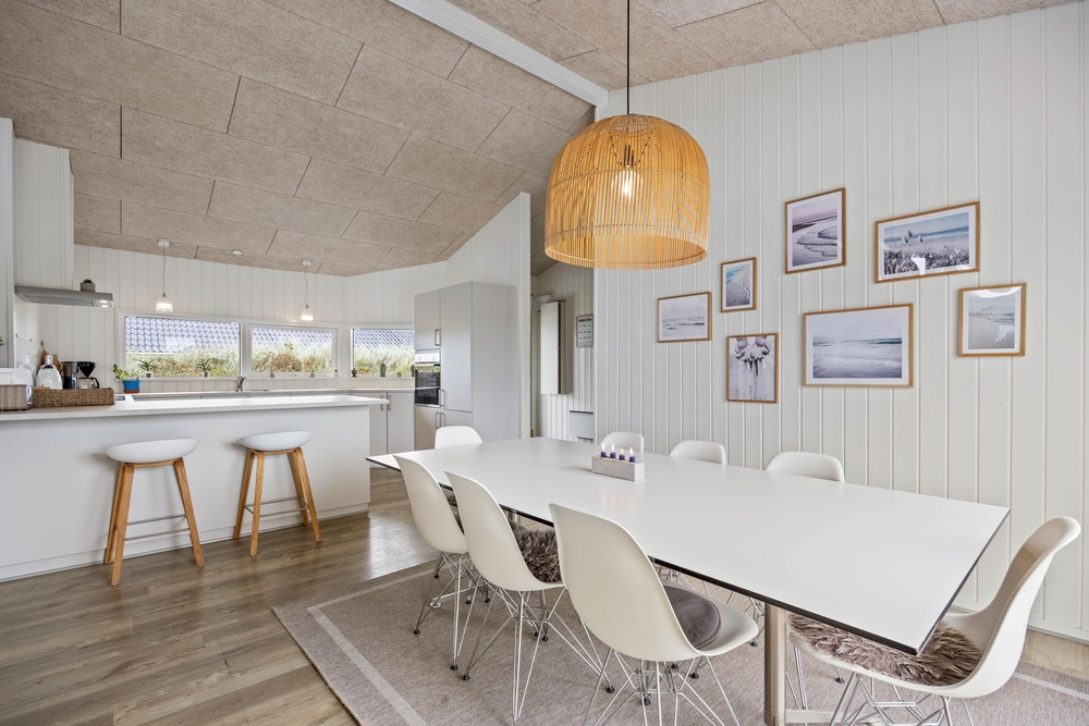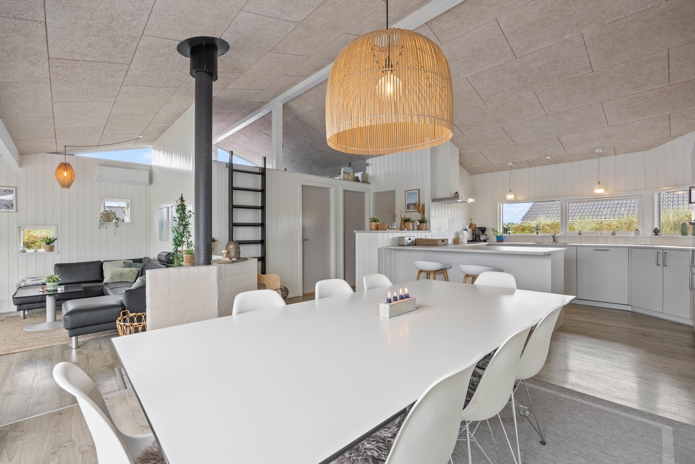 Im angrenzenden Essbereich mit der offenen Küche könnt ihr gemeinsame Kochabende verbringen und auch mal ein typisch dänisches Rezept ausprobieren. Die gut ausgestattete Küche bietet hochwertige Einbaugeräte, die keine Wünsche offenlassen. Natürlich darf hier auch ein Geschirrspüler und eine 90 l fassende Gefriermöglichkeit nicht fehlen. Hier ist Platz für den einen oder anderen selbst geangelten Fisch.