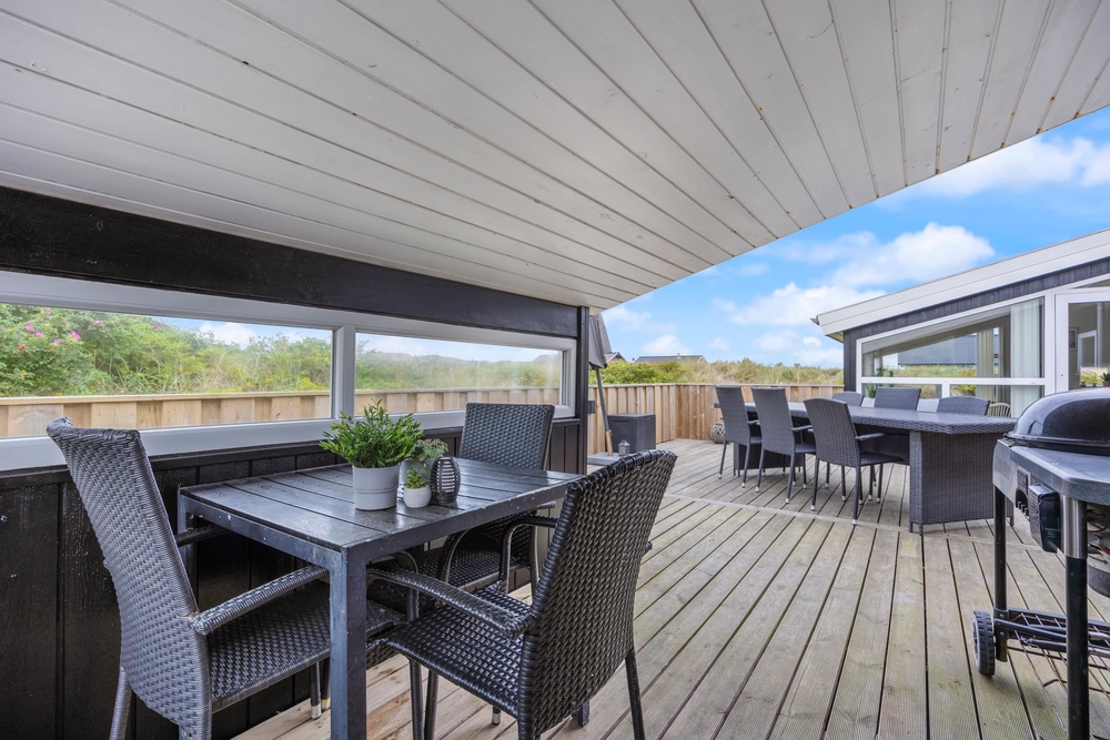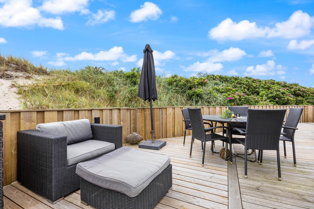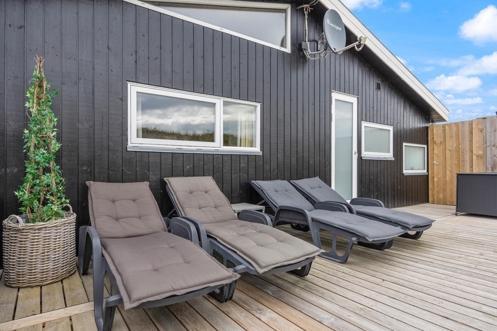 Auf der südlichen und westlichen Seite des modernen Ferienhauses erstreckt sich eine großzügige Holzterrasse, welche teils abgeschirmt und auch teils überdacht ist. Hier könnt ihr bei jedem Wetter ein gemütliches Plätzchen finden. Dafür stehen euch hochwertige und bequeme Gartenmöbel zur Verfügung.