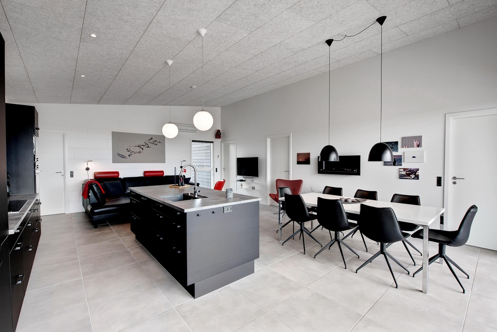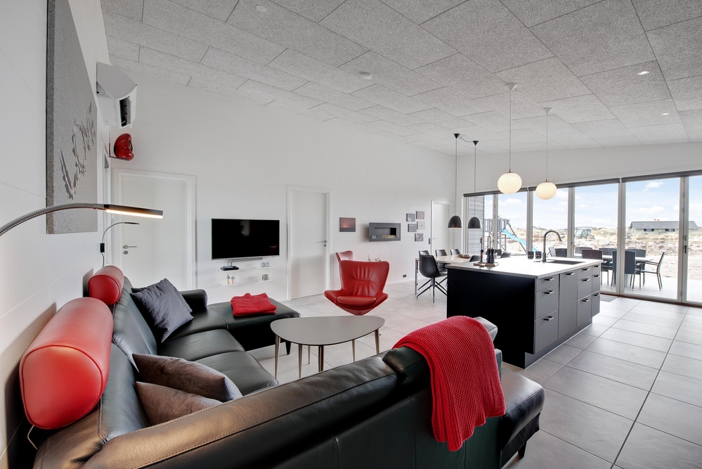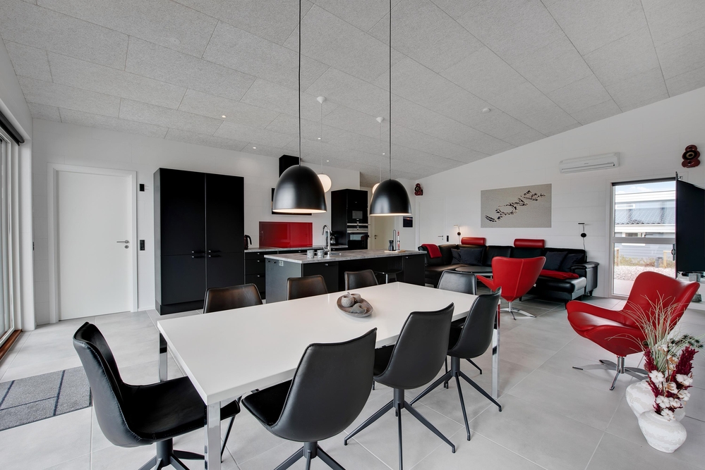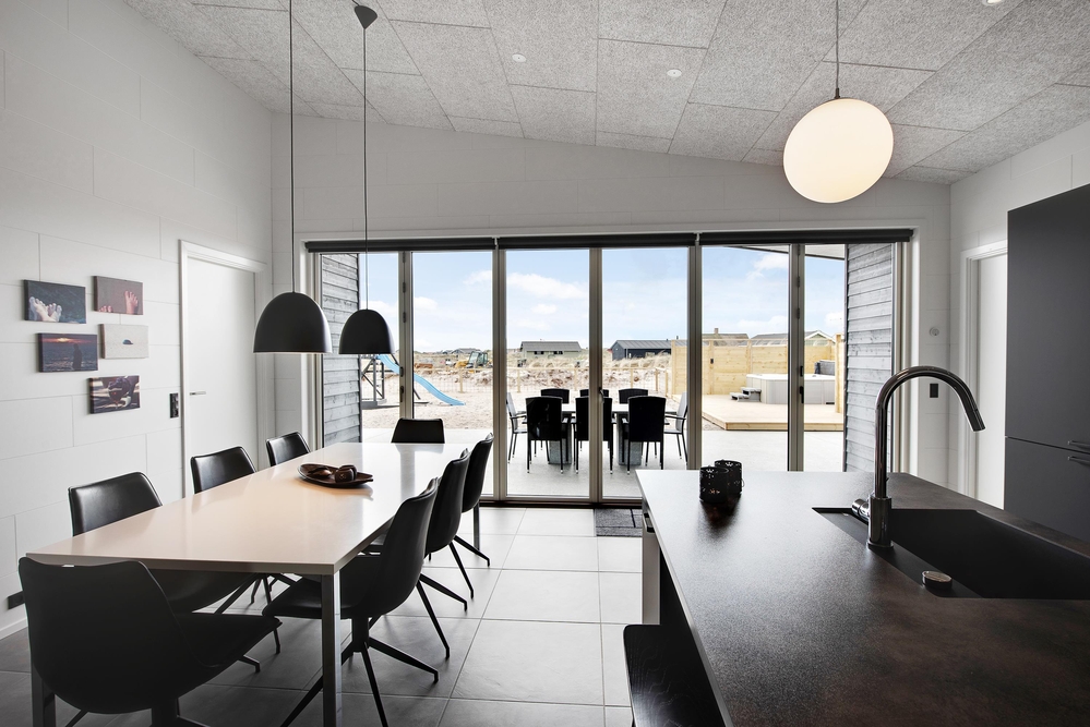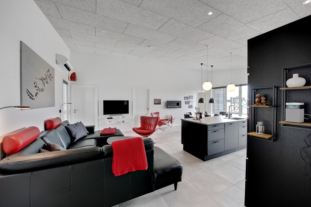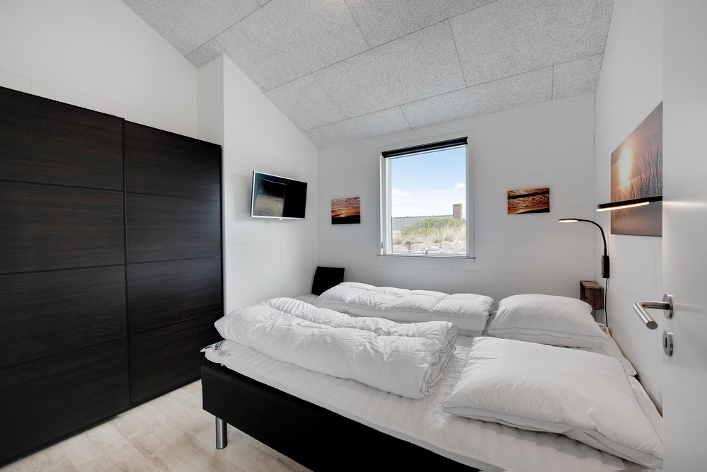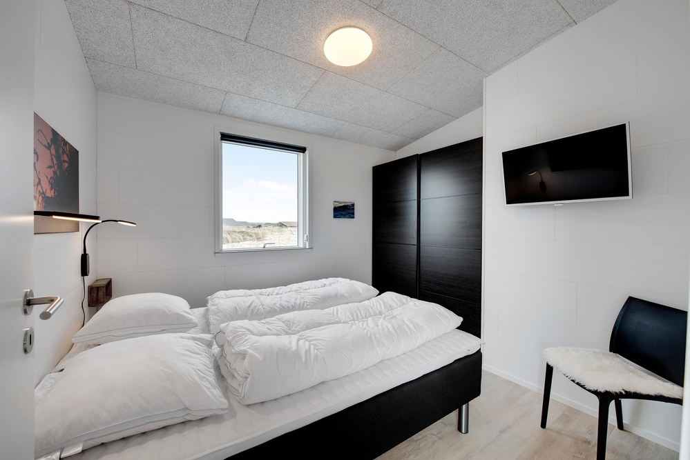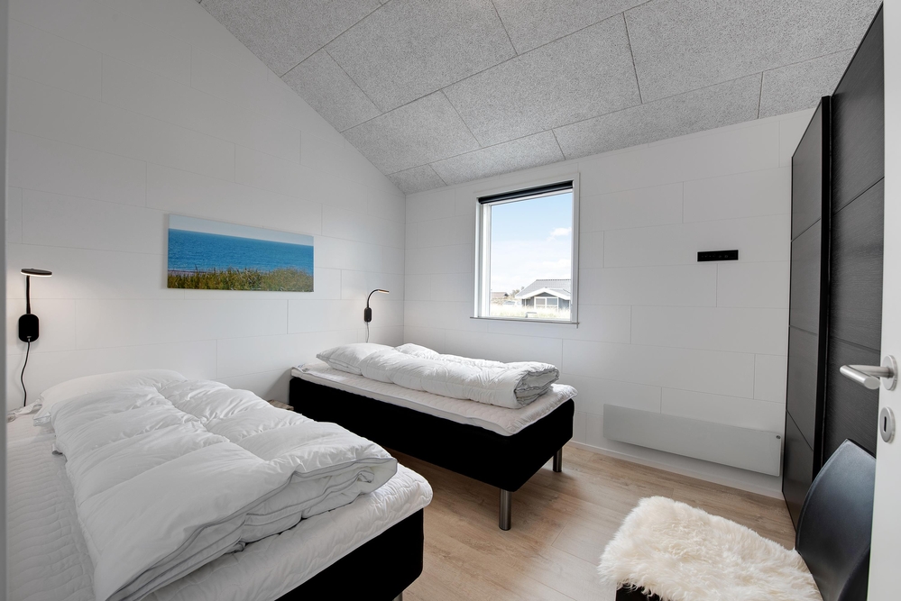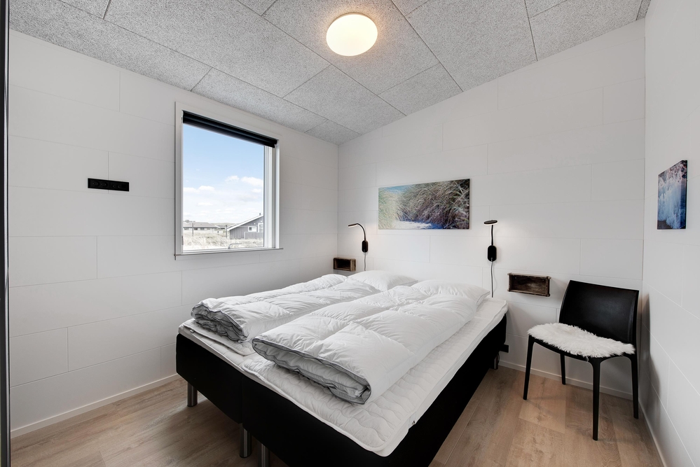 Das Ferienhaus kann idealerweise in 2 Bereiche aufgeteilt werden, da sich vom gemeinschaftlichen Wohnbereich jeweils zur linken und rechten Seite 2 Schlafräume und ein Badezimmer befinden. Die Innenausstattung ist qualitativ hoch und im modernen skandinavischen Stil mit klaren Linien.