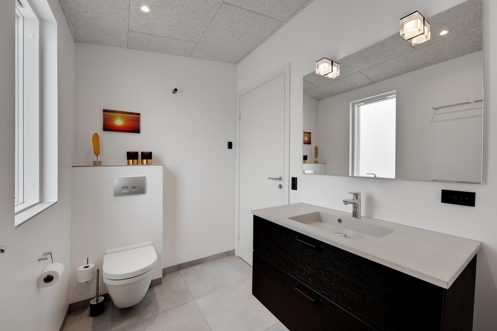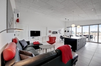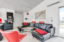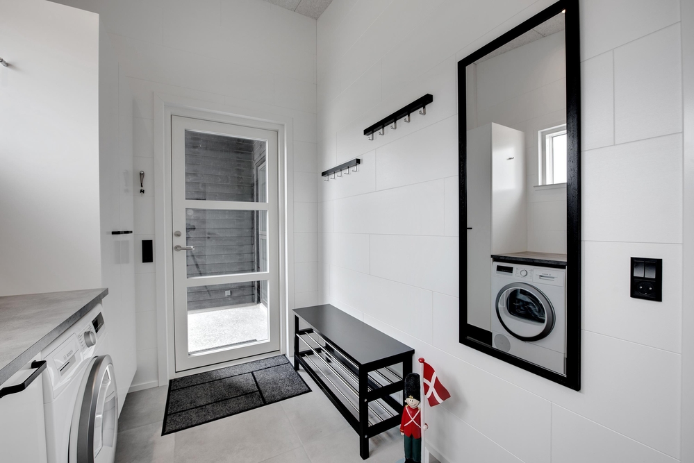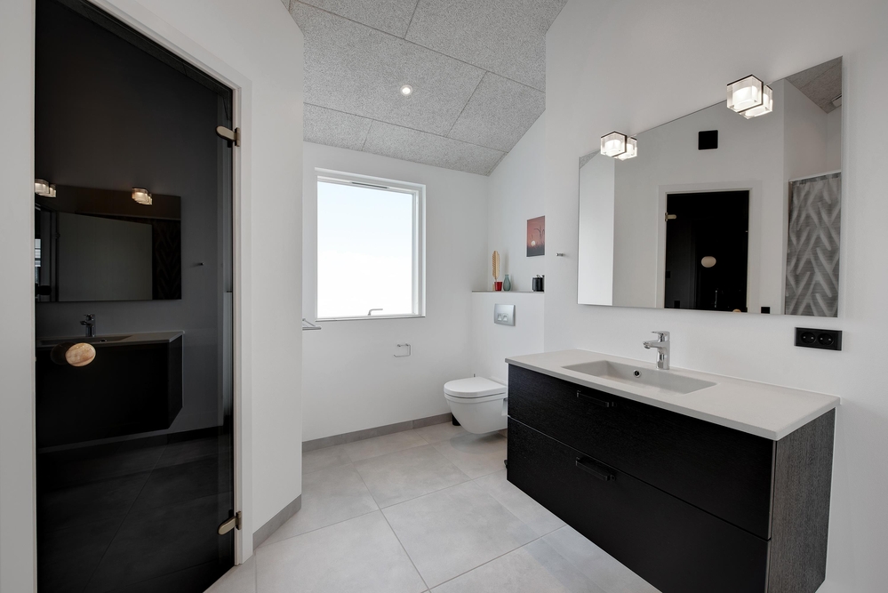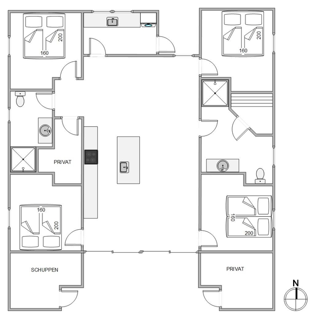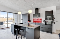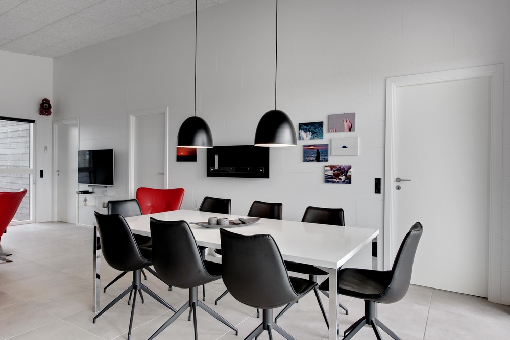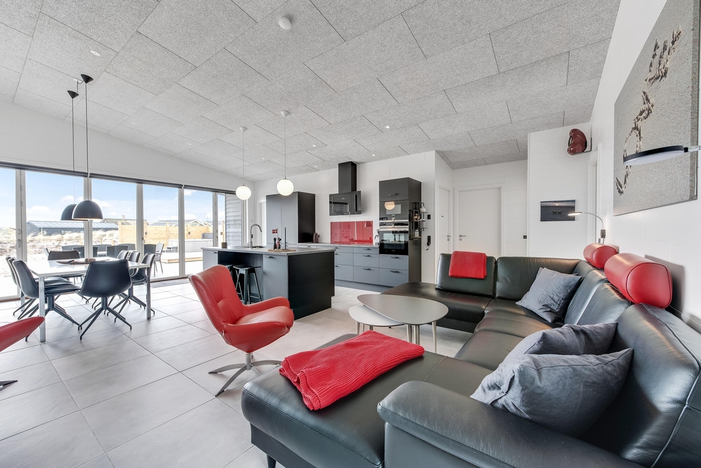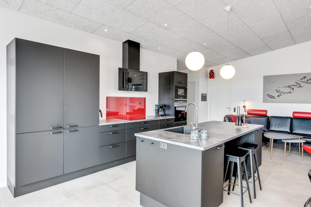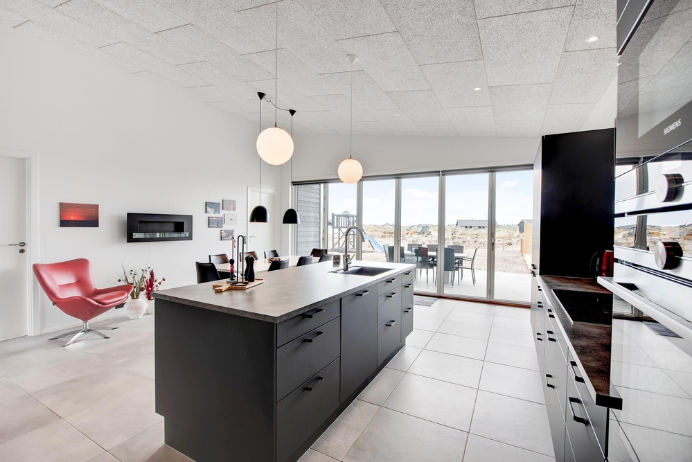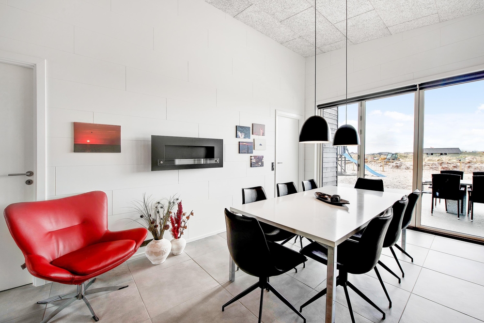 Das Ferienhaus kann idealerweise in 2 Bereiche aufgeteilt werden, da sich vom gemeinschaftlichen Wohnbereich jeweils zur linken und rechten Seite 2 Schlafräume und ein Badezimmer befinden. Die Innenausstattung ist qualitativ hoch und im modernen skandinavischen Stil mit klaren Linien.
