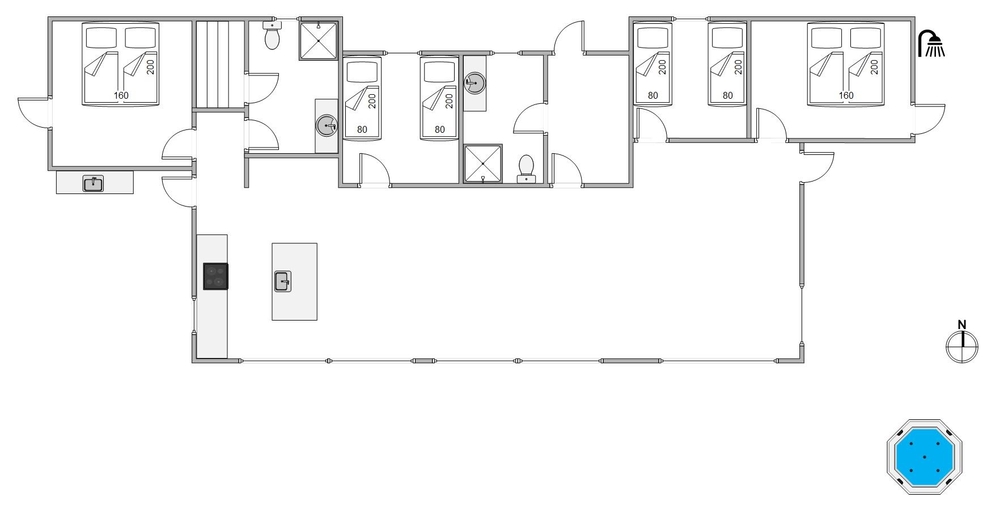 Die offene, mit dem Wohnraum verbundene Küche sorgt für Beisammensein auch während des Zubereitens eurer leckeren Speisen. Eine Wärmepumpe sorgt für eine angenehme Temperatur im Wohnbereich. Für eine entspannte Nachtruhe könnt ihr euch auf vier einzelne Schlafzimmer mit Elektroheizungen zurückziehen. Hier erwarten euch zwei bequeme Doppelbetten sowie vier komfortable Einzelbetten. Die Badezimmer sind praktisch mit einer Fußbodenheizung und Elektroheizungen ausgestattet.
