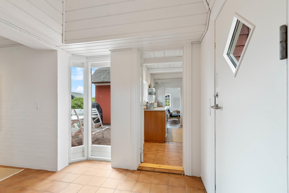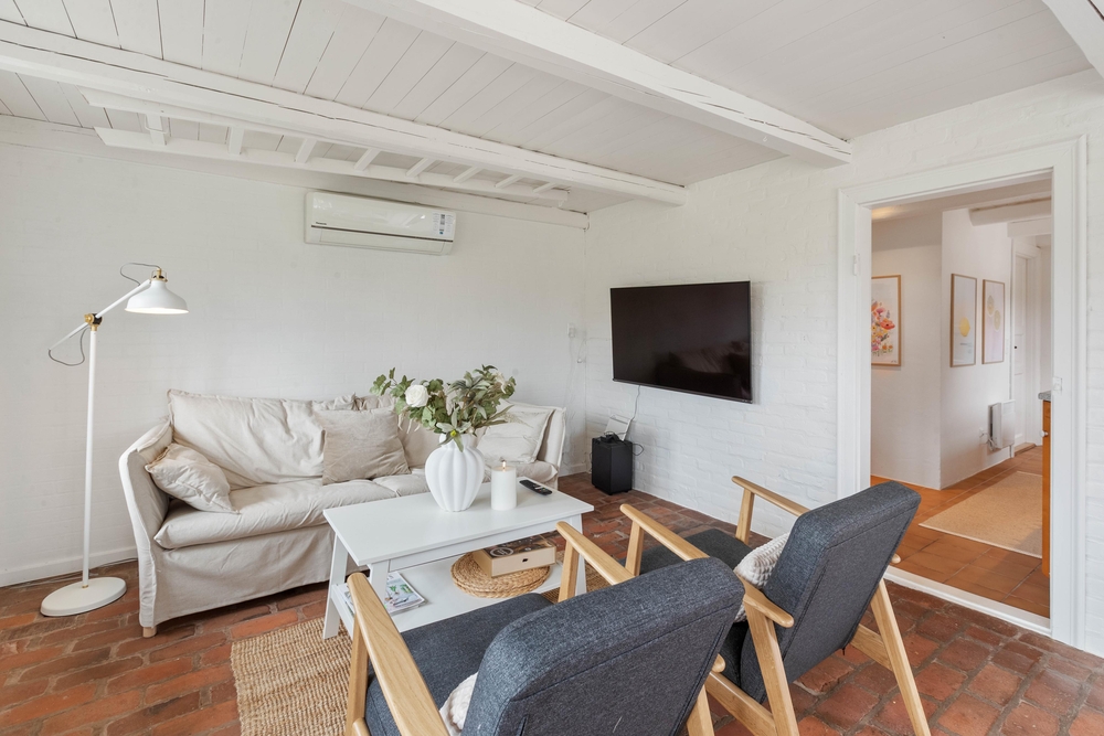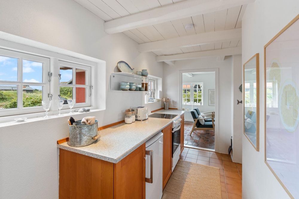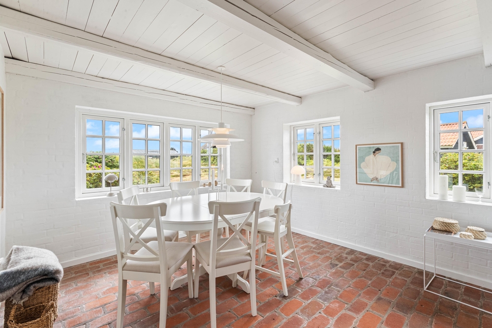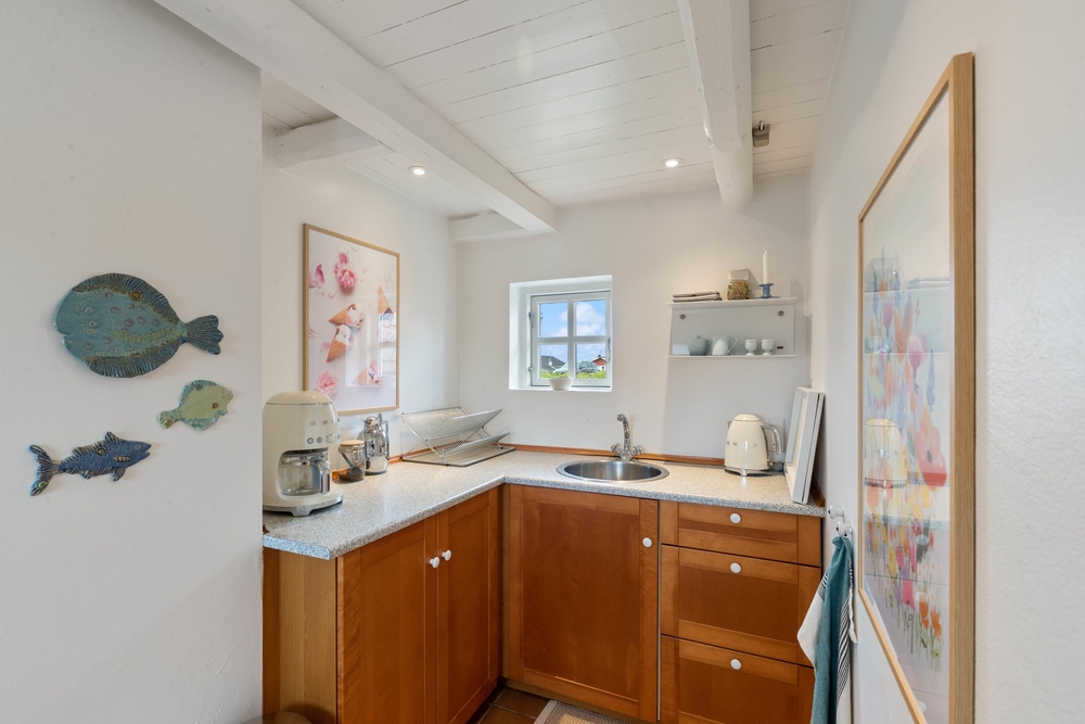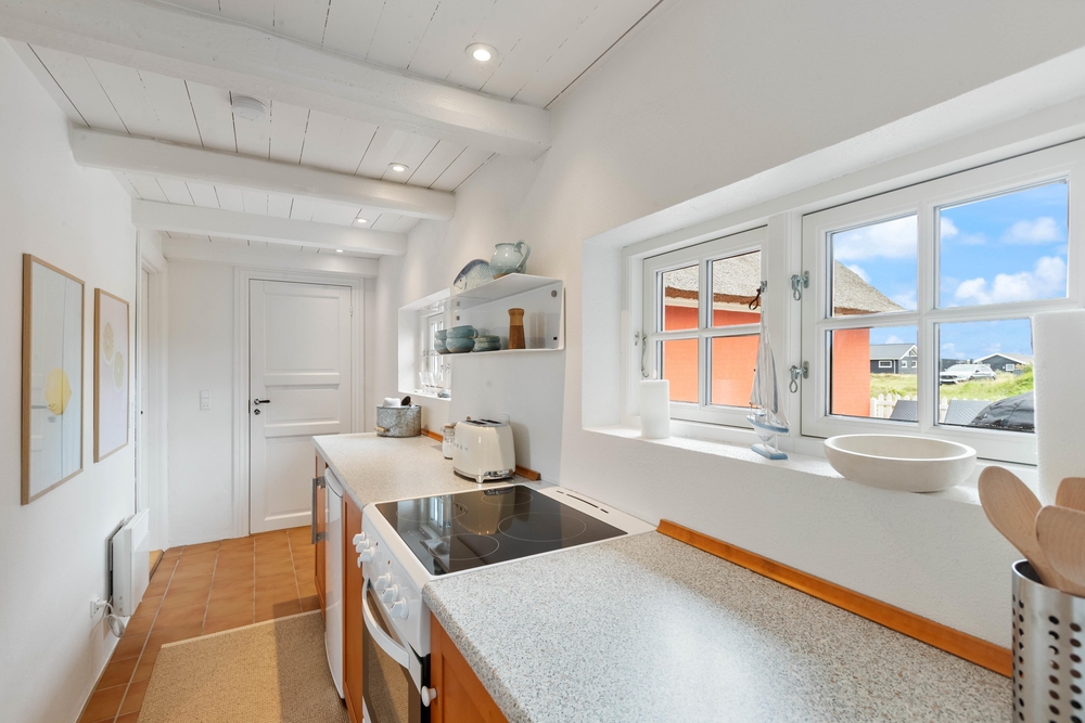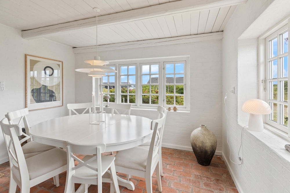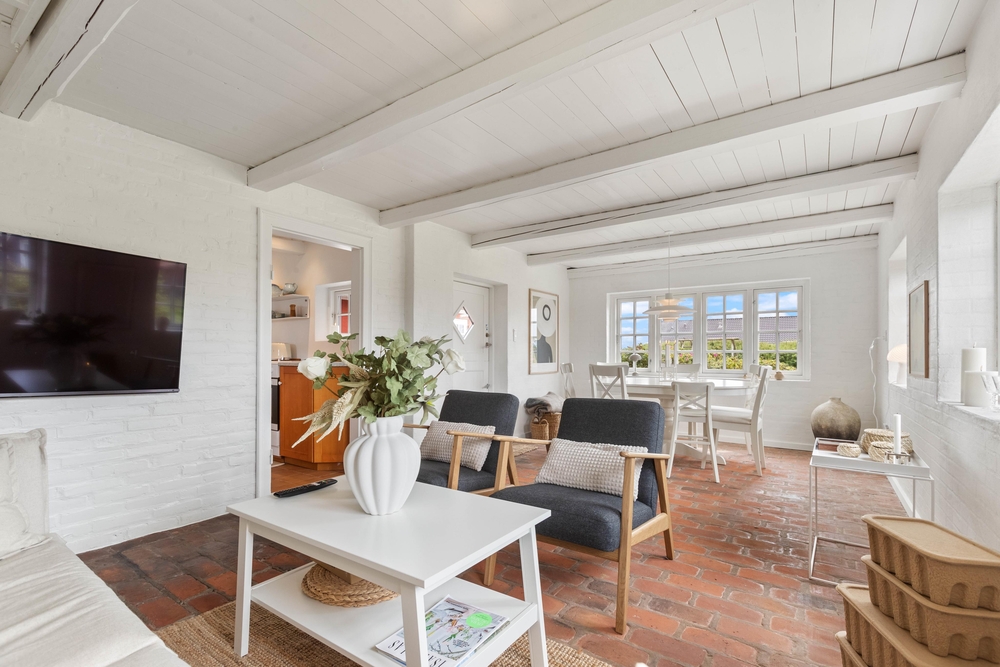 Das Zentrum dieses reetgedeckten Ferienhauses bildet der mit Klinkern geflieste Wohnbereich, der mit seinen hellen Farben und zahlreichen Fenstern, den typisch skandinavischen Charme ausstrahlt. Am Esstisch könnt ihr eure selbst zubereiteten Mahlzeiten zu euch nehmen oder das eine oder andere Brettspiel spielen. Um den Abwasch kümmert sich danach der Geschrirrspüler.