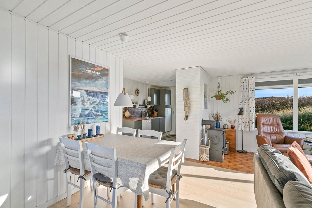 Im Ferienhaus im Arvidvej 338 sind Küche, Wohnzimmer und Essbereich in einem gemütlichen und großzügigen Wohnraum vereint. Hier könnt ihr sicher viele gemütliche Stunden miteinander verbringen. Während die einen kochen, können die anderen fernsehen oder Brettspiele spielen. So könnt ihr die Zeit zusammen genießen, während der Kamin im Hintergrund knistert und zur gemütlichen Urlaubsatmosphäre beiträgt.