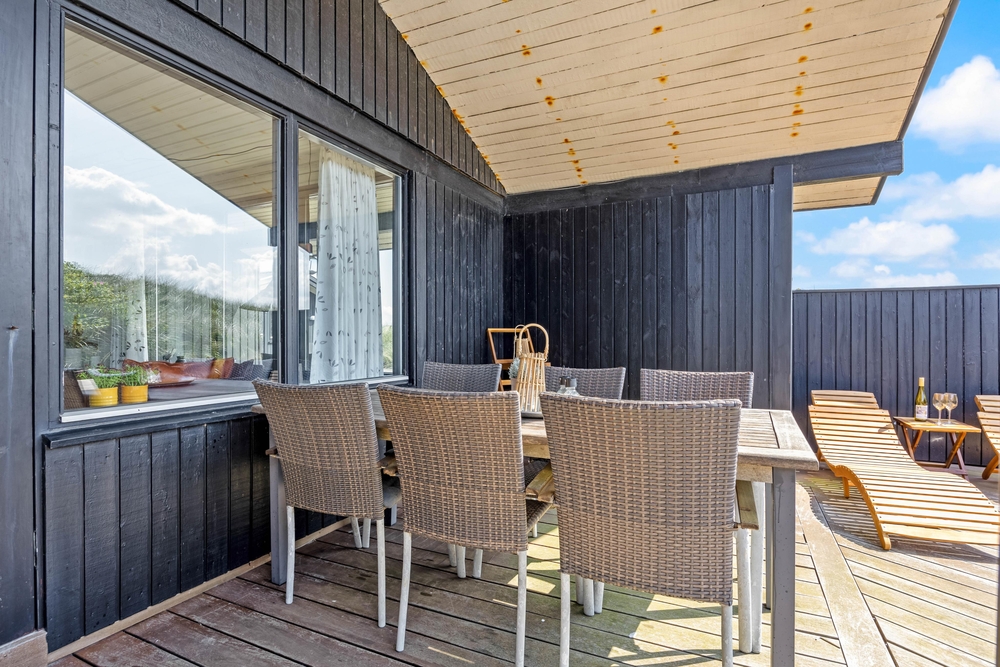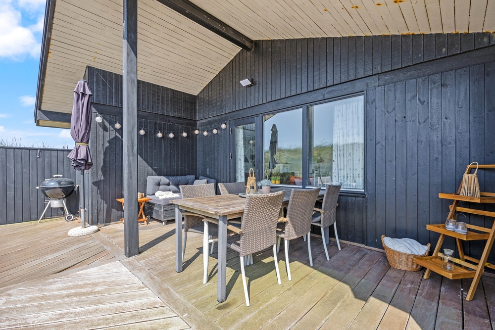 An verschiedenen Seiten des Ferienhauses erwarten euch schöne Terrassenbereiche mit Gartenmöbeln und Liegestühlen. Bringt euer Lieblingsbuch mit und genießt die wärmende Sonne, während euer Hund auf dem Grundstück herumtollen kann. Ein Teil der Terrasse ist überdacht, so dass ihr im Schatten sitzen und hier gemeinsam euer Mittag essen könnt. Auch der hauseigene Gasgrill steht für ein leckeres BBQ bereit.