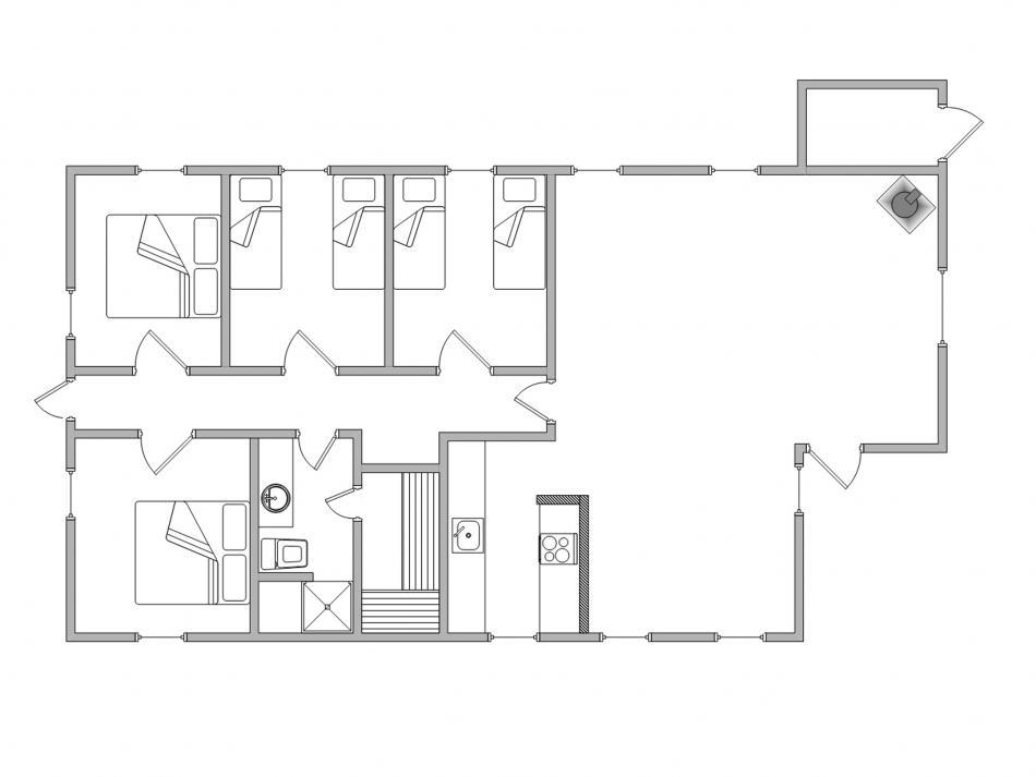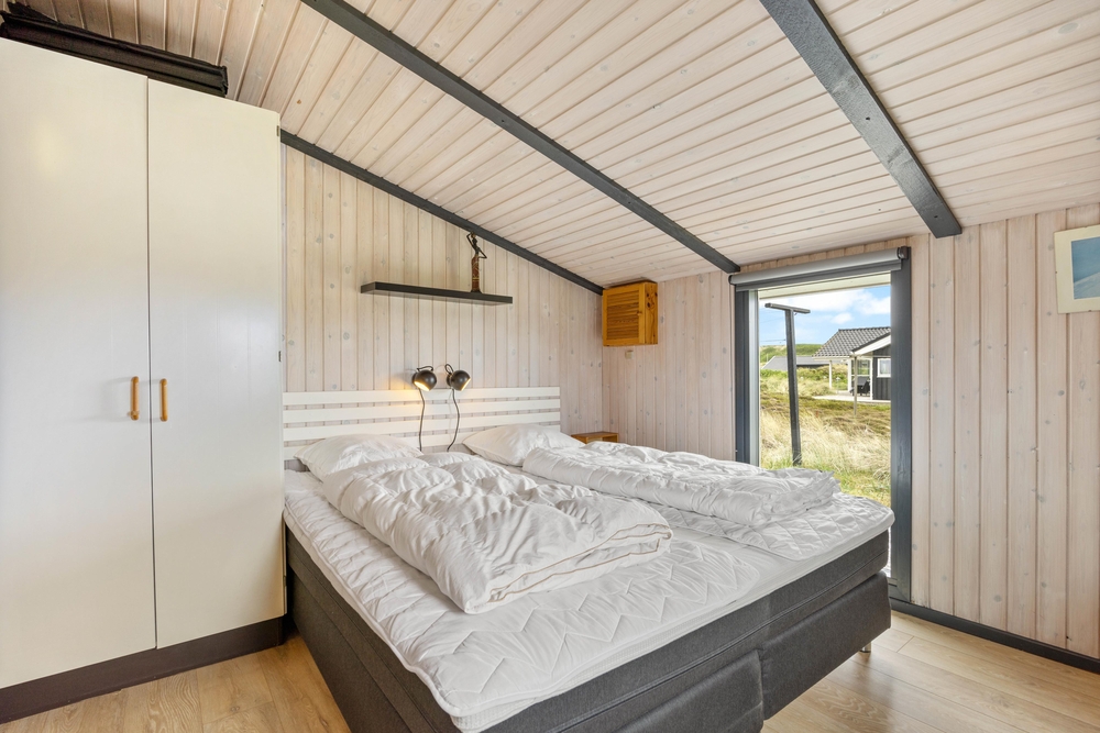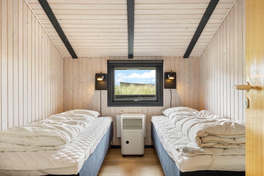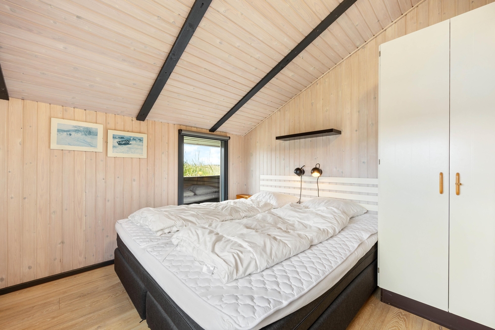 Der Schlafbereich des Ferienhauses besteht aus vier einzelnen Schlafzimmern, wobei zwei mit Doppelbetten und zwei mit jeweils zwei Einzelbetten ausgestattet sind. Das Badezimmer verfügt über Fußbodenheizung.