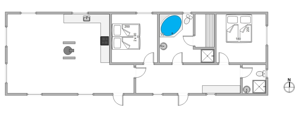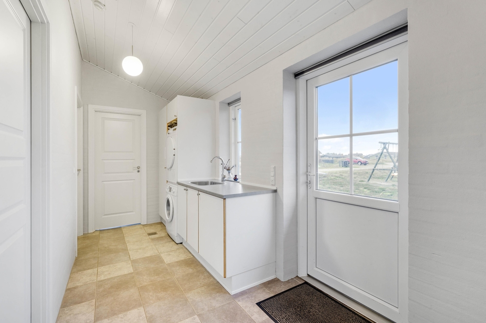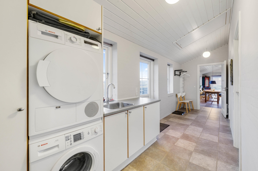 Beim Betreten des klassischen Ferienhauses findet man sich zunächst in einem praktischen Hauswirtschaftsraum wieder. Hier habt ihr Platz für eure Schuhe und Jacken und hier findet ihr auch die praktische Waschmaschine und den Trockner. Von hier aus habt hier auch Zugang zu den beiden Schlafzimmern mit bequemen Doppelbetten, sowie zu den beiden Badezimmern.