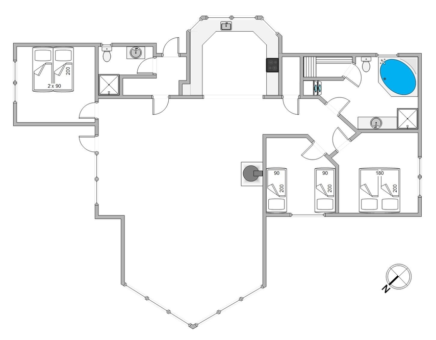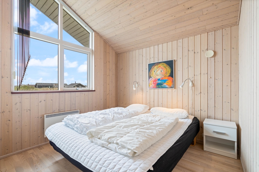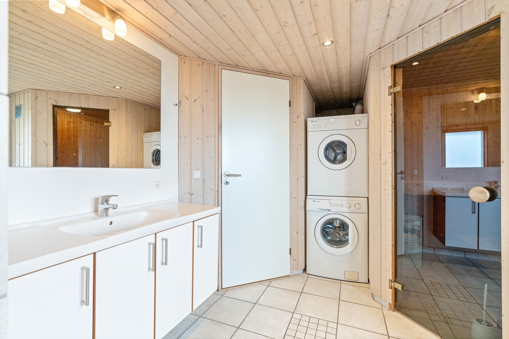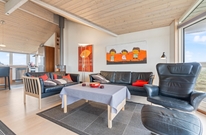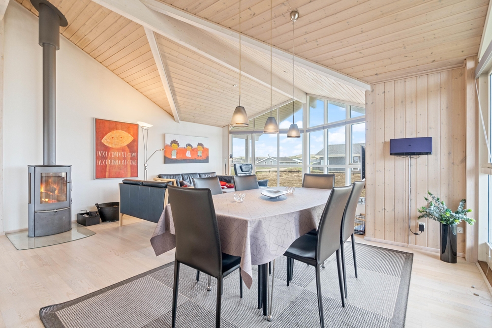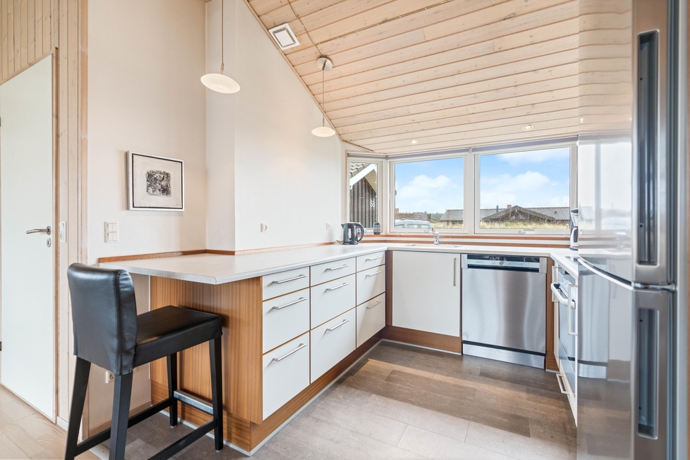 Das Ferienhaus ist hell und freundlich mit hellen Holzböden im Wohn- und Schlafzimmer, hellen Wänden und hohen Decken. Im Wohnzimmer gibt es schöne große Fenster sowohl nach Norden als auch nach Süden. Das Wohnzimmer ist modern möbliert und der tolle Holzofen sorgt nicht nur für Wärme, sondern auch für gemütliche Stimmung. Die Küche ist geräumig und mit allen gängigen Haushaltsgeräten ausgestattet, wie z.B. Geschirrspüler und Gefrierschrank (74 l). Darüber hinaus verfügt das Ferienhaus über 3 Schlafzimmer, zwei davon mit Doppelbetten und das letzte mit 2 Einzelbetten. Es gibt 2 Badezimmer mit Duschkabine und Fußbodenheizung, und das große Badezimmer hat auch noch Sauna und Whirlpool.
