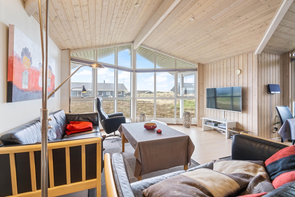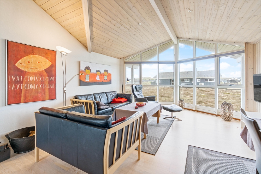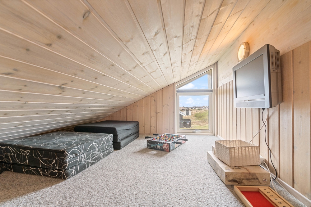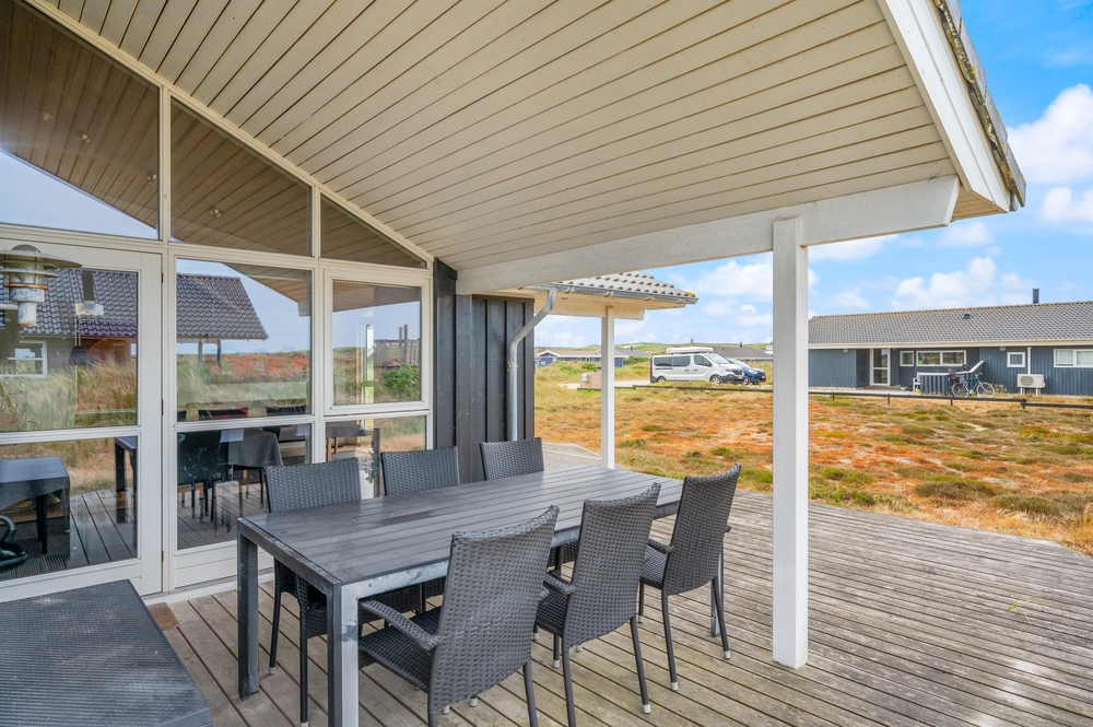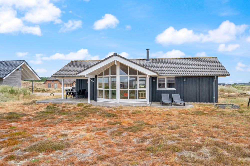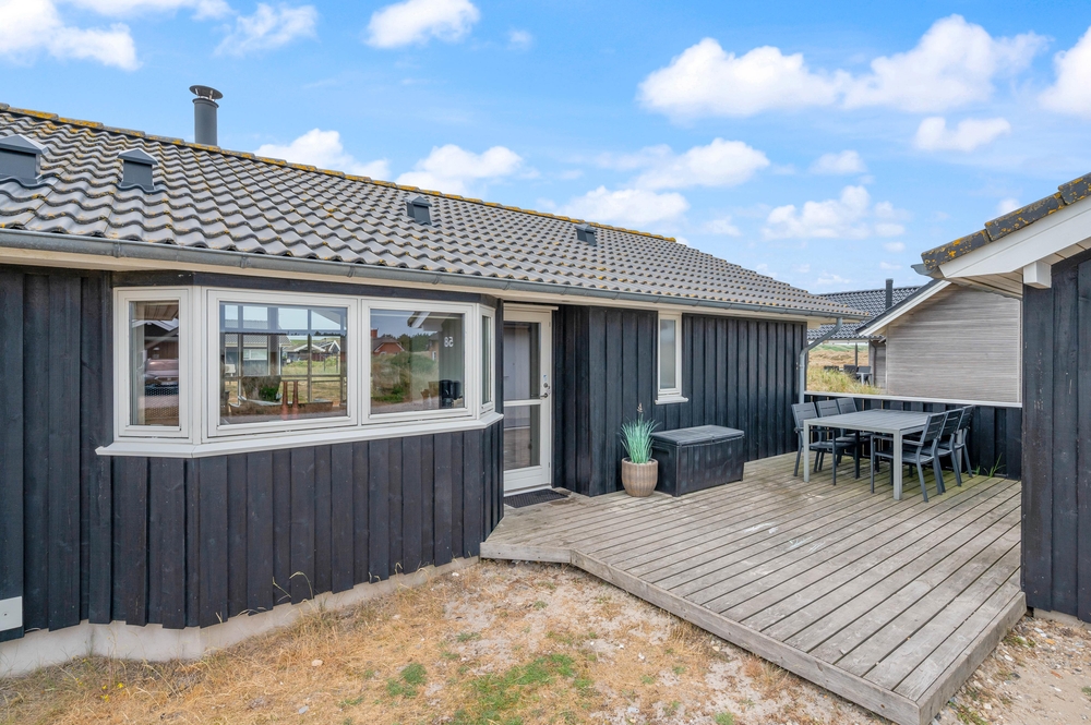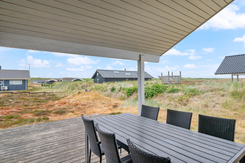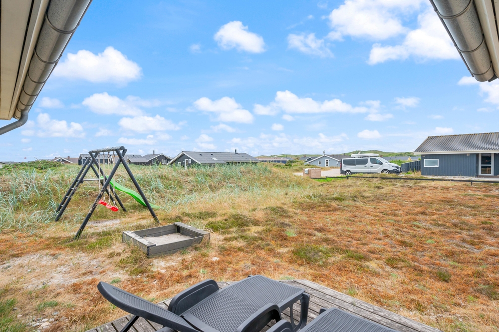 Drei Seiten des Hauses sind mit Terrassen versehen. Die hölzernen Nord- und Westterrasse sind mit einander verbunden und beide sind teilweise überdacht. Darüber hinaus gibt es eine schöne windgeschützte Ostterrasse zwischen dem Haus und dem Abstellraum, die perfekt für windige Tage ist. Das schöne heidebewachsene Naturgrundstück liegt nur wenige Meter von einem großen Naturschutzgebiet entfernt ? ideal für Wanderungen. Der Abstand zur Nordsee beträgt bloß 400 m.