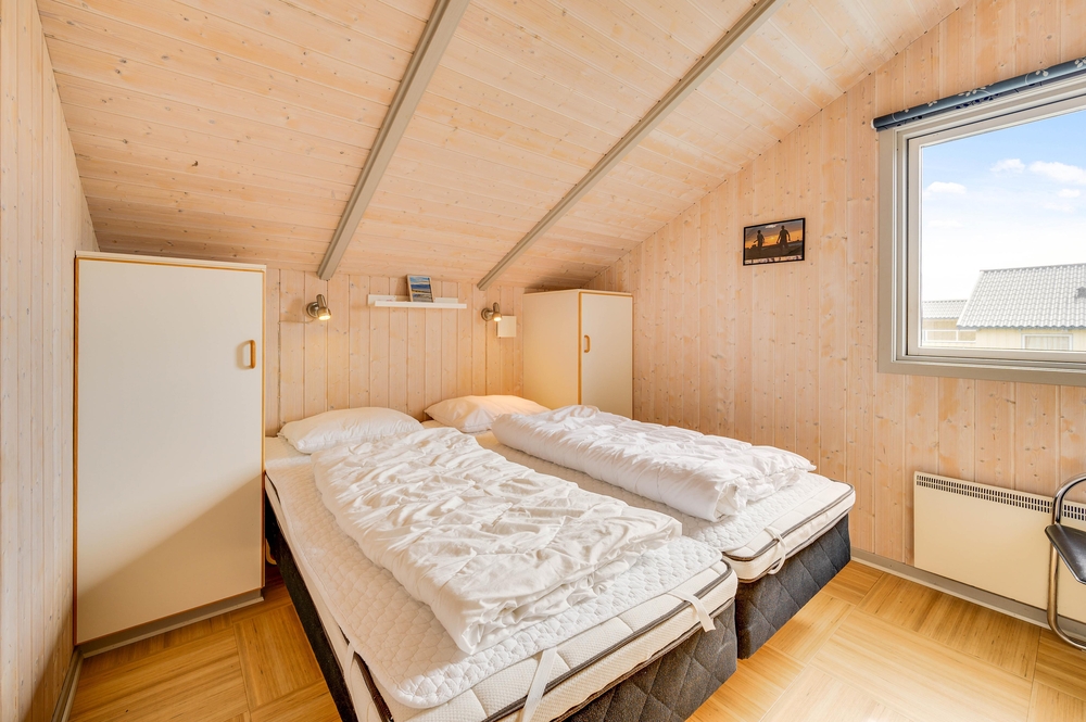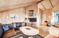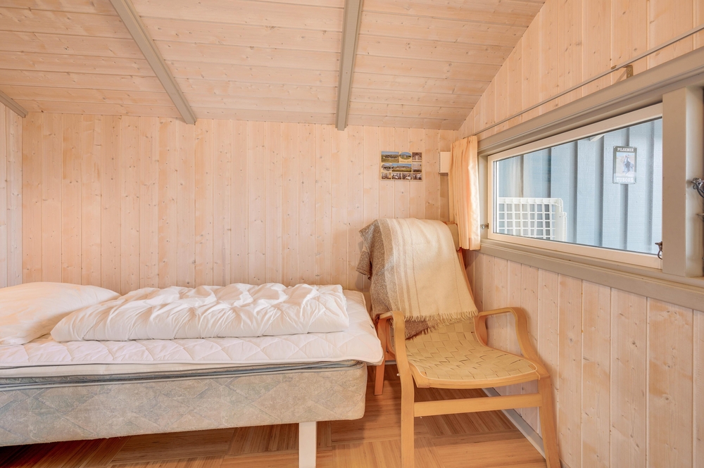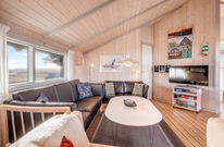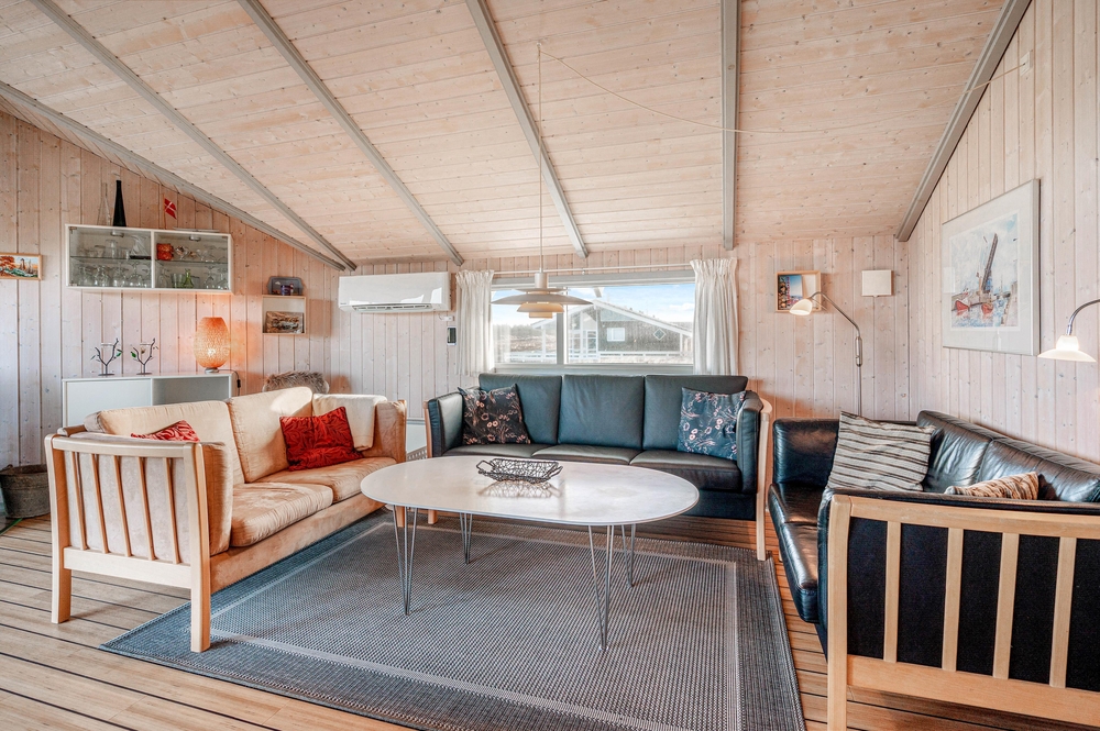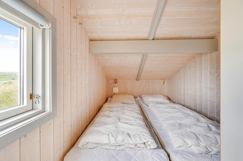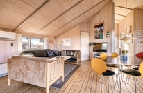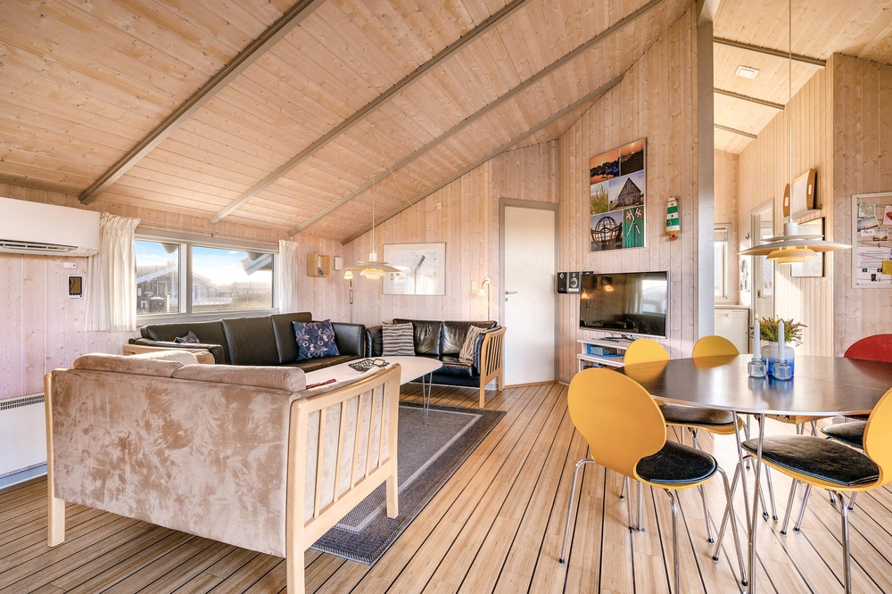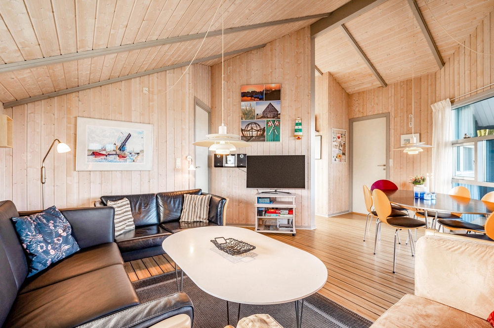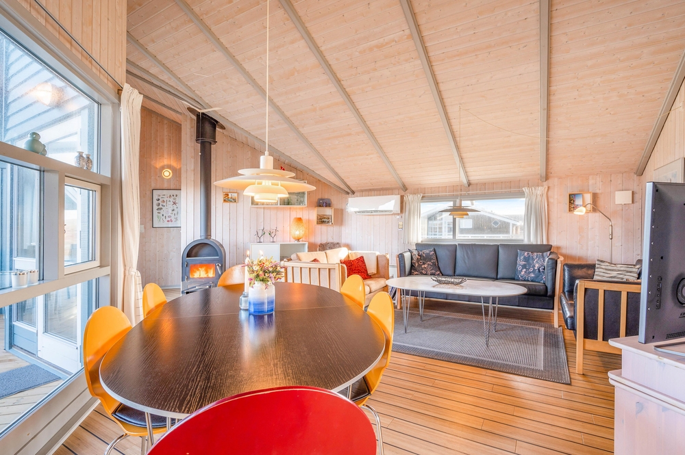 Den Mittelpunkt dieses gemütlichen Ferienhauses bildet der großzügige Wohnbereich mit offener Küche und Essplatz. Von diesem Hauptraum gehen alle anderen Zimmer ab. Die liebevoll ausgewählte Einrichtung harmoniert mit den schrägen Decken und offenen Dachbalken und sorgt für eine hyggelige Atmosphäre.