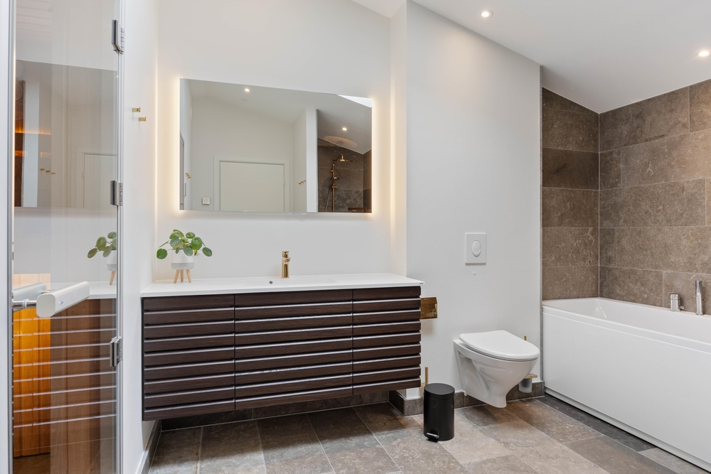 Es gibt zwei voll ausgestattete Badezimmer mit Fußbodenheizung und in einem davon, erwartet euch ein Whirlpool und eine Sauna, welche euch den Stress und die Sorgen des Alltags vergessen lassen und für Erholung sorgen.