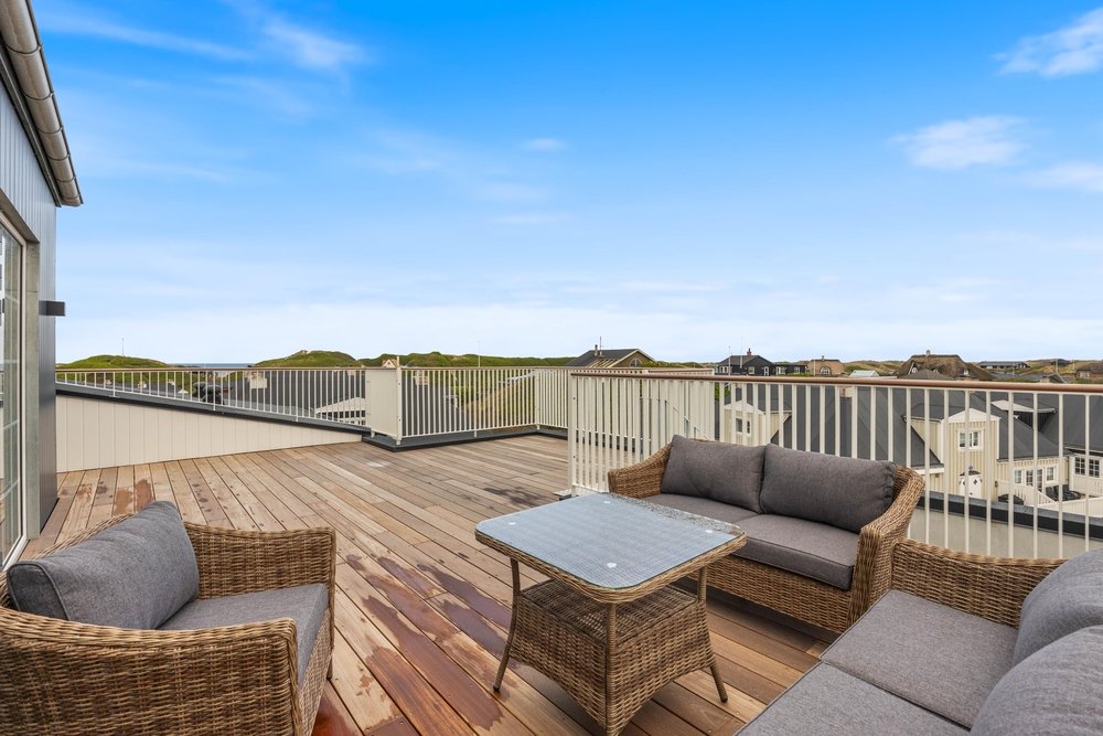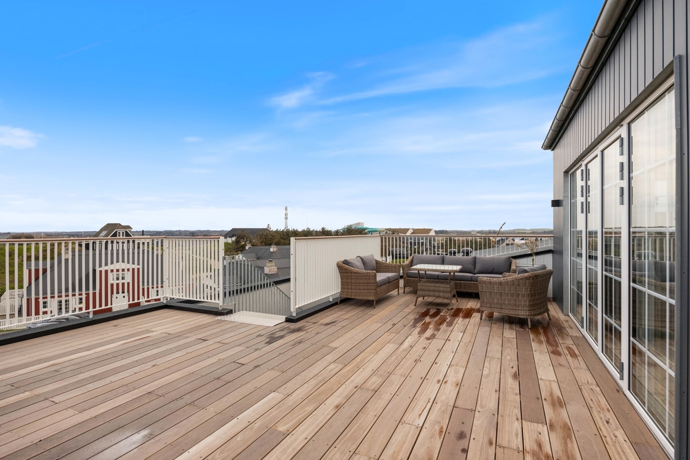 Stellt euch vor, es stehen köstliche Snacks, spritzige Getränke und brennende Kerzen auf dem Tisch, während ihr beobachtet, wie die Sonne, über den Dünen im Meer versinkt. Das hört sich nicht nur traumhaft an, es kann Wirklichkeit auf der Dachterrasse dieser Ferienwohnung werden. Auf der gut geschützten teilweise überdachten 212 m2 großen Dachterrasse könnt ihr euch auch bei weniger gutem Wetter aufhalten. Wenn die Sonne scheint, entspannt euch bei einem herrlichen Sonnenbad, lasst euch dabei die frische Meeresluft um die Nase wehen und genießt die Panoramaaussicht. Wenn ihr Lust auf einen Grillabend habt, könnt ihr den hauseigenen Gasgrill benutzen.
