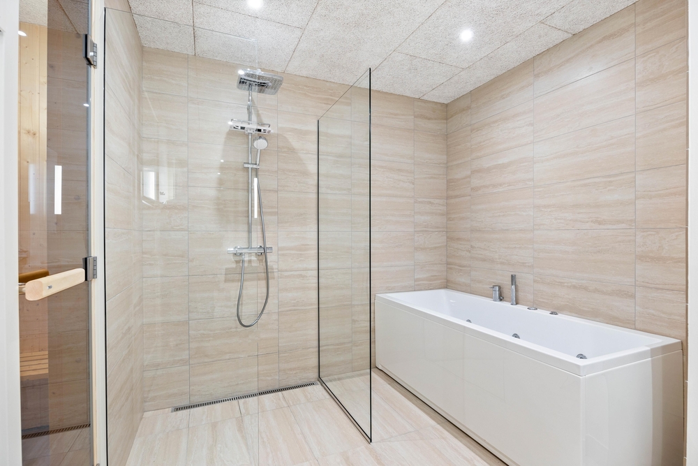 In der oberen Etage gibt es zwei Schlafzimmer. Das eine hat ein Doppelbett und in dem anderen Schlafzimmer befinden sich zwei Einzelbetten. Um das Reisegepäck zu reduzieren, gibt es im Badezimmer eine Waschmaschine und einen Trockner. Die pure Entspannung setzt nach einem langen Strandsparziergang ein, wenn ihr die Sauna und den Whirlpool genießt.