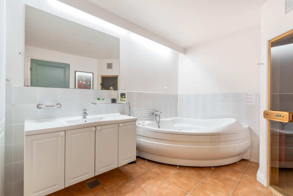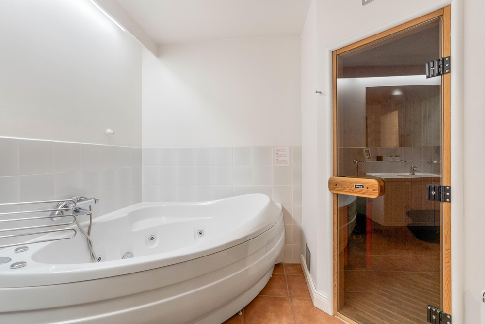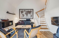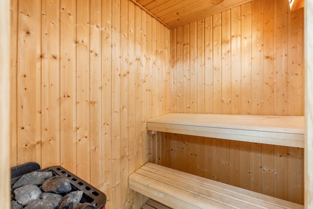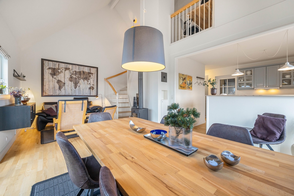 Der Wohn- und Essbereich ist offen mit der Küche verbunden, sodass ihr gemeinsam Kochen könnt oder gemeinsam auf den Sofas im Wohnzimmer entspannt. Das gemütliche und helle Wohnzimmer hat einen schönen Holzofen, der nicht nur Wärme spendet, sondern auch die perfekte Urlaubsatmosphäre schafft. Im Erdgeschoss befindet sich auch das Badezimmer der Ferienwohnung, dessen Highlight der Whirlpool und die Sauna sind. Hier könnt ihr im Whirlpool und in der heißen Sauna entspannen, um euer Wohlgefühl noch zu verstärken. Auch nach einem Strandspaziergang oder einem Bad in der Nordsee ist das perfekt.