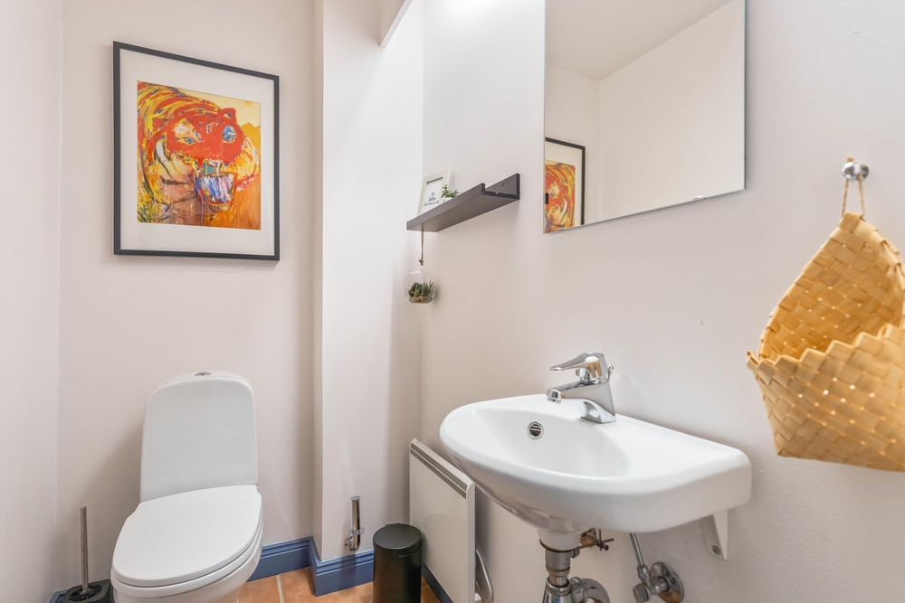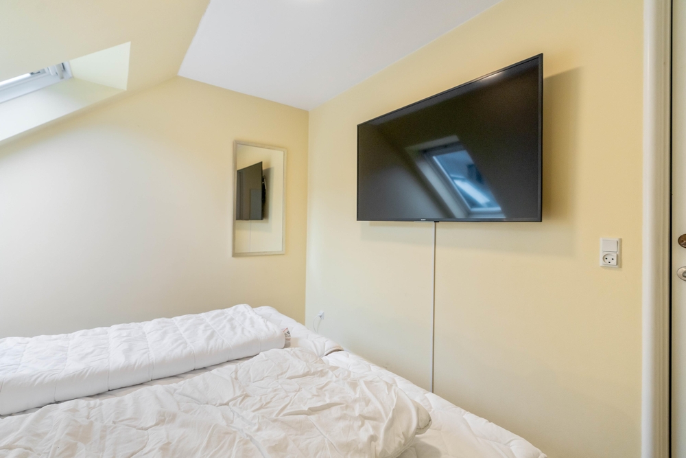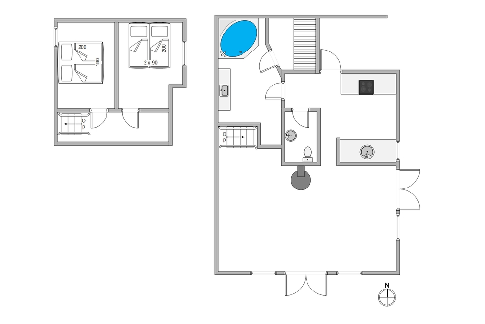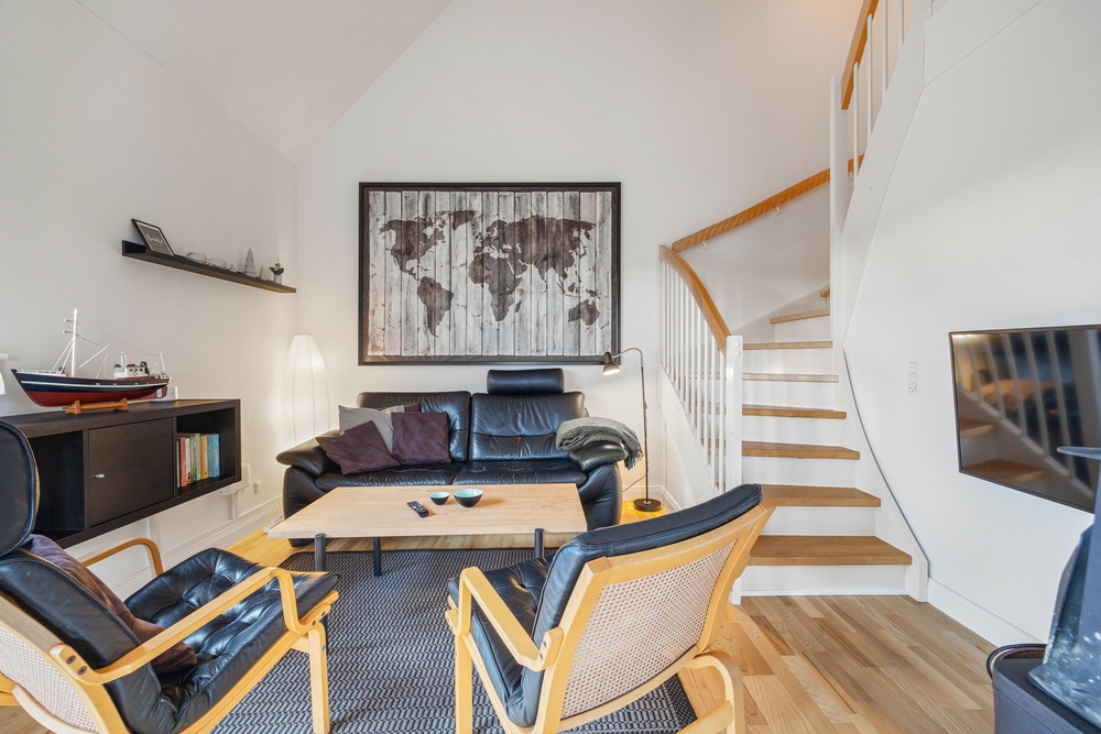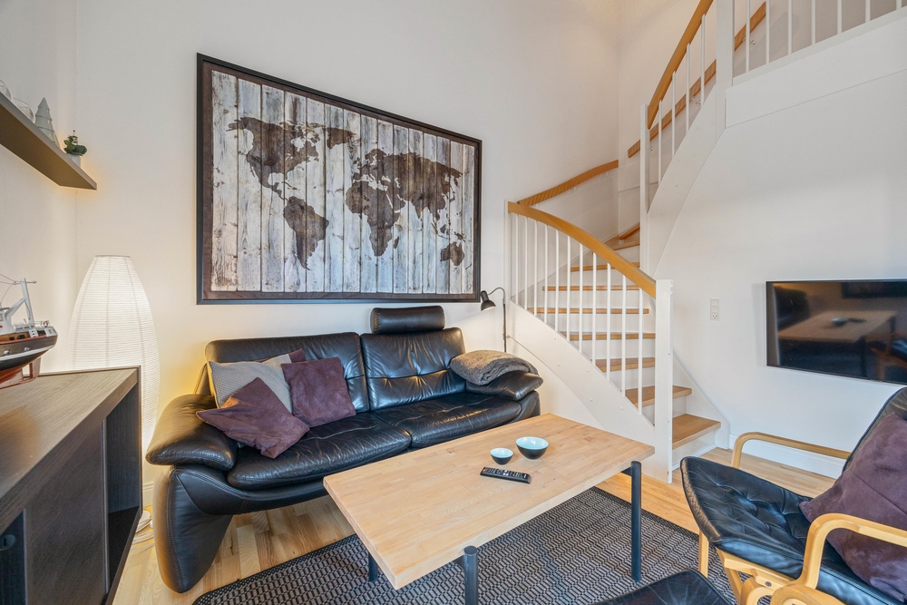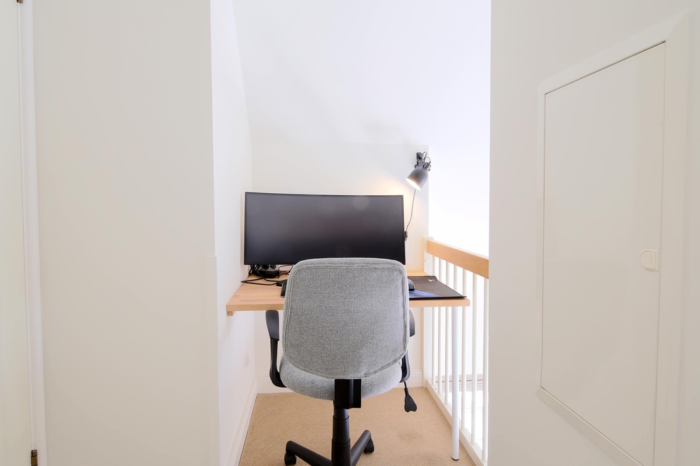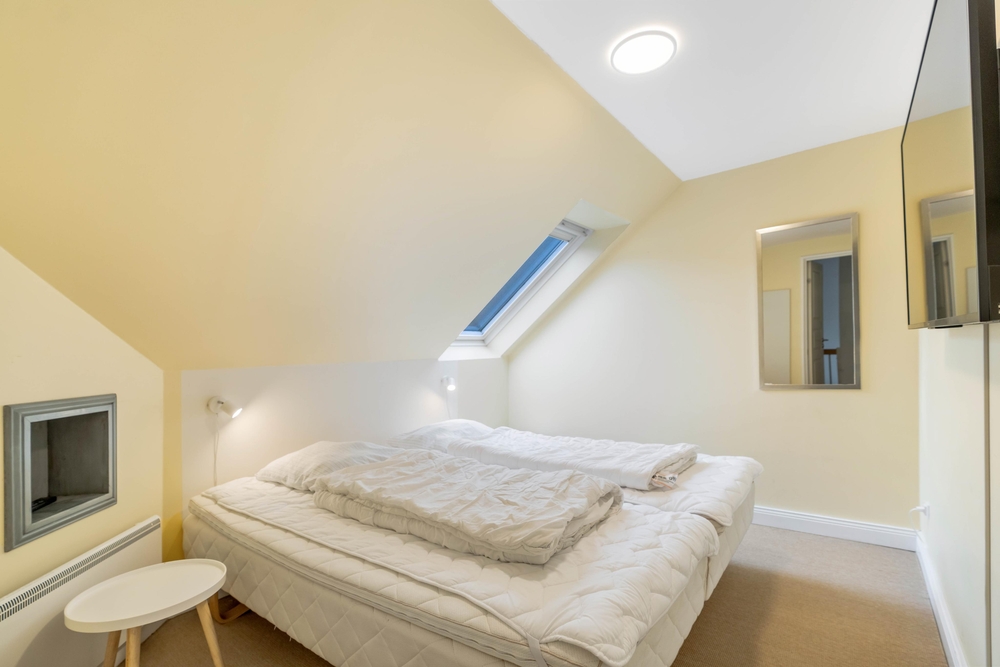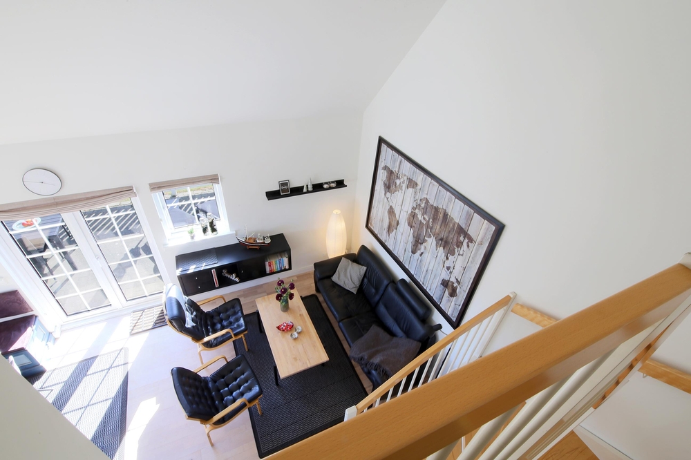 Die 90 Quadratmeter der Wohnung sind auf zwei Etagen verteilt. In der ersten Etage befinden sich die beiden Schlafzimmer. In beiden Schlafzimmern könnt ihr nachts, in den Doppelbetten, eure Batterien wieder aufladen. Auf der Empore findet ihr einen kleinen Schreibtisch mit einem Computer, von dem aus ihr in den Wohnbereich hinunterschauen könnt.