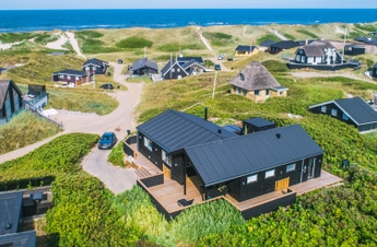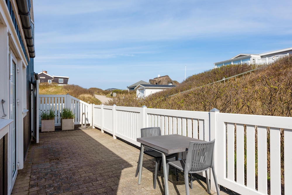 Vom Wohnzimmer aus gibt es zwei Ausgänge zur abgeschirmten Terrasse mit Blick auf Søndervigs wunderschöne Dünenlandschaft. Gartenmöbel, Sonnenliegen und Grill sind bereit, um die heißen Sommertage mit Sonnenbaden und gemütlichen Grillabenden noch schöner zu machen. Eine Markise bietet Schutz.