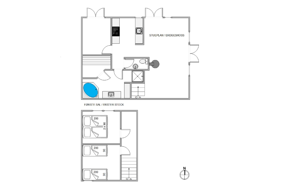 Im Erdgeschoss befindet sich die Küche, die offen mit dem Essbereich und dem Wohnzimmer verbunden ist ? das Zentrum des Ferienhauses, das die ganze Familie zusammenbringt. Darüber hinaus das große Badezimmer mit Sauna und Whirlpool sowie eine Gästetoilette, beide mit Fußbodenheizung. Nach einem langen Spaziergang an der frischen Seeluft gönnt ihr euch etwas Wellness und genießt.