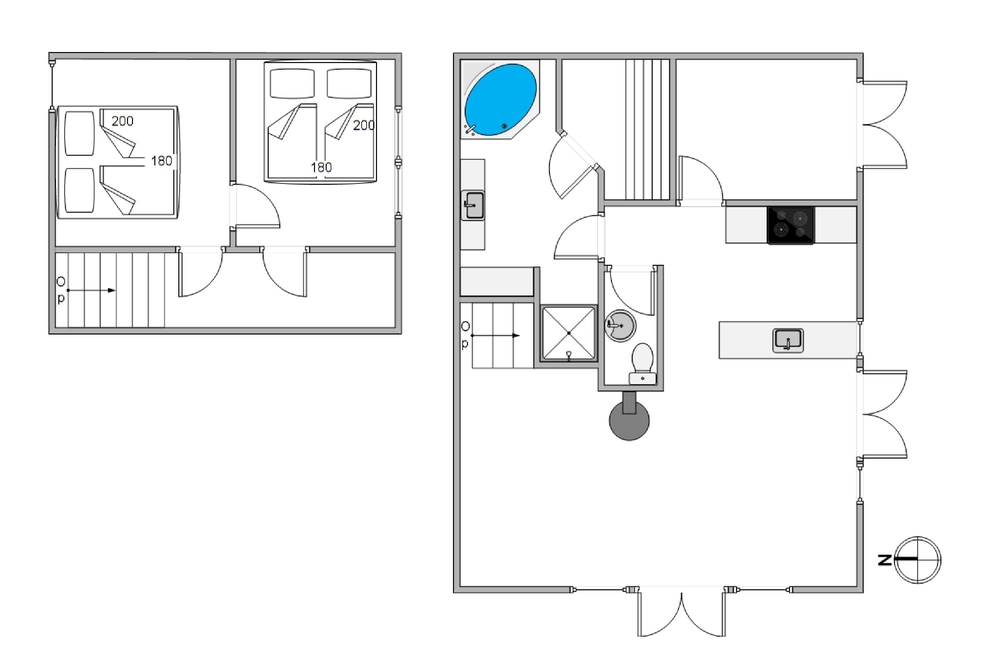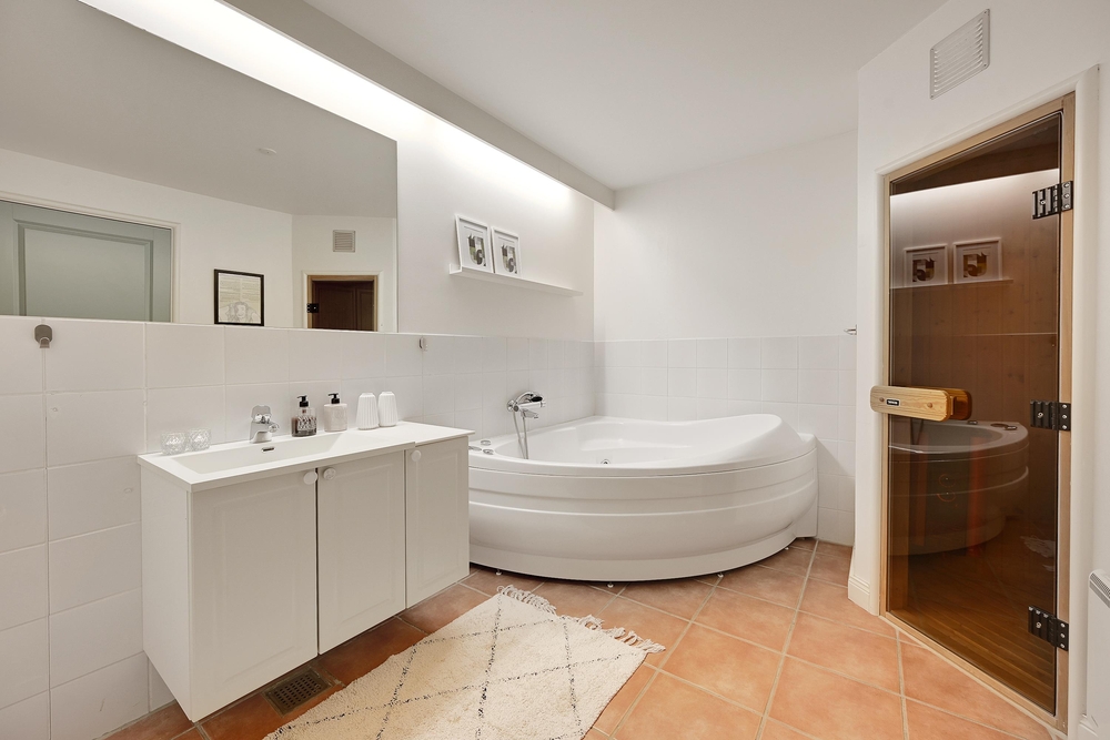 Im 1. Stock befinden sich zwei Schlafzimmer, in denen ihr euch wunderbar erholen könnt. Das Badezimmer mit Sauna und Whirlpool und Fußbodenheizung bietet euch die hauseigene Wellnessoase, in der ihr einfach mal die Seele baumeln lassen könnt. Um euer Reisegepäck schon vor der Anreise zu reduzieren, stehen euch eine Waschmaschine und ein Trockner zur Verfügung.