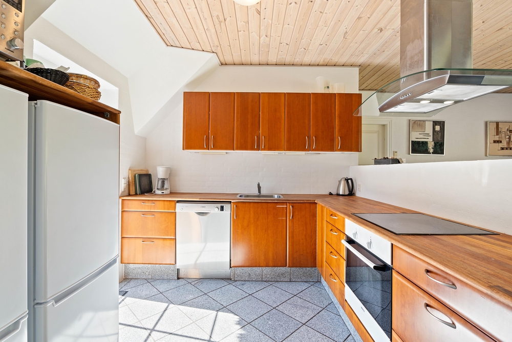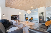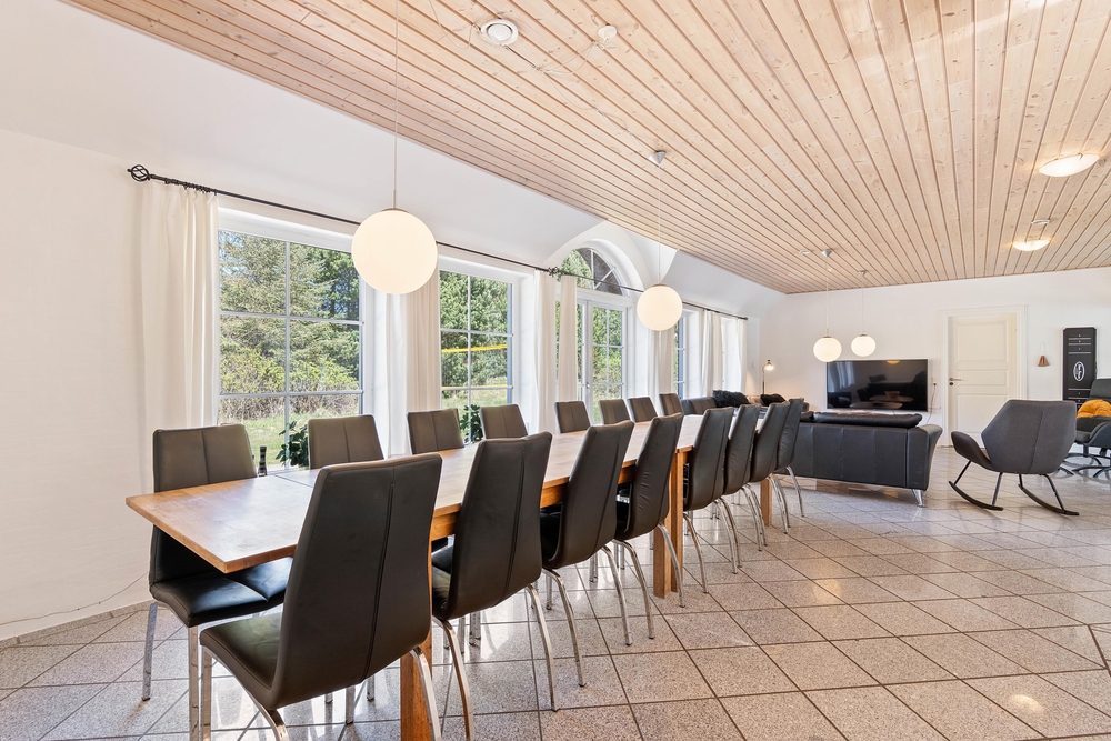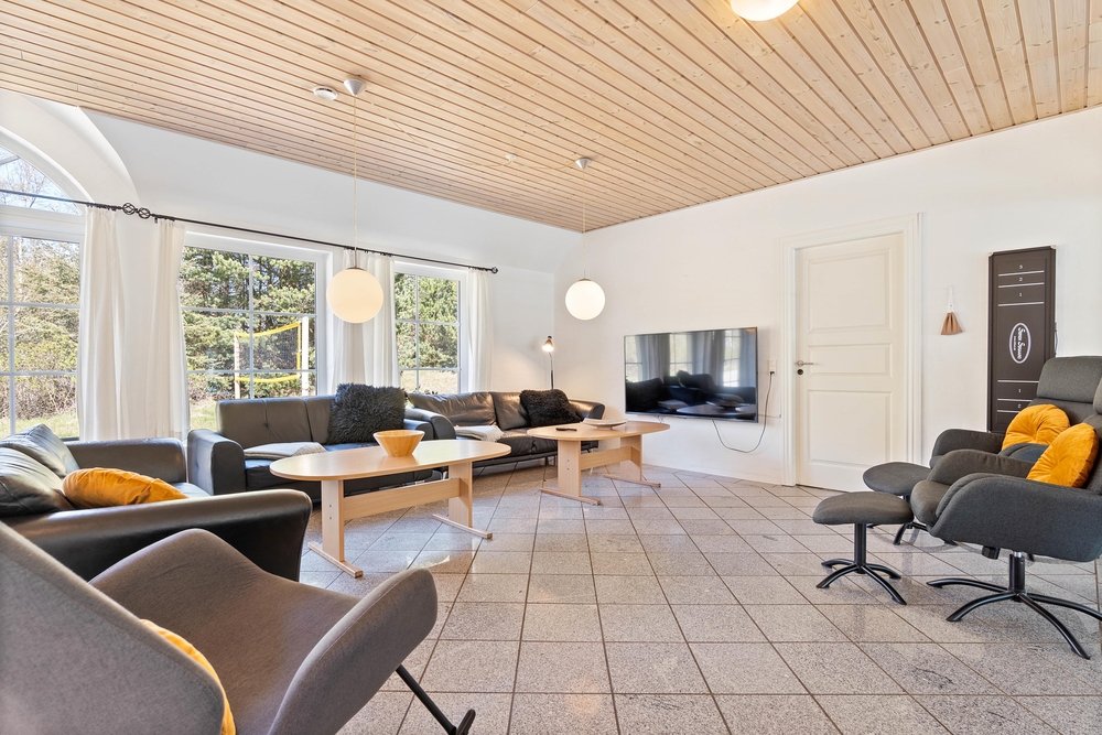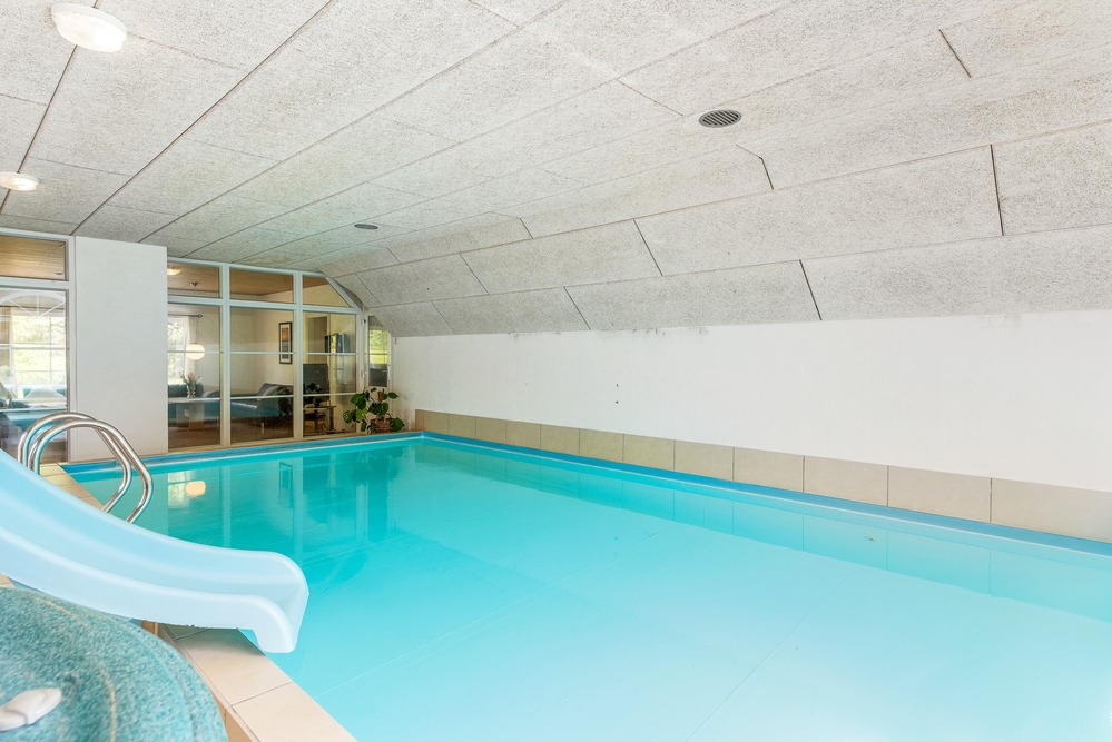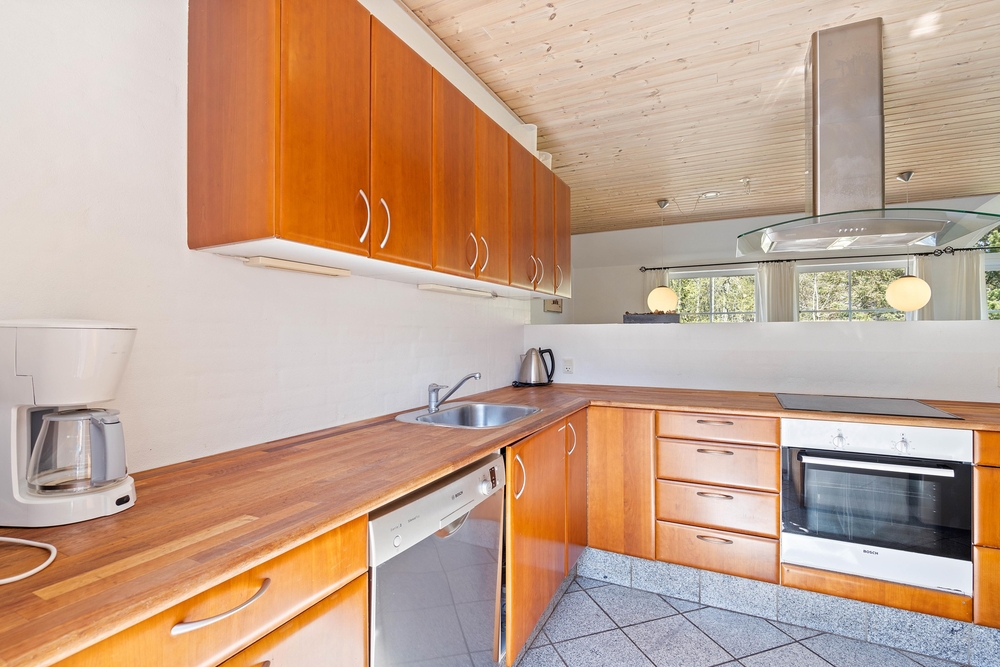 Die Ausstattung des Ferienhauses auf Bækbyvej 64 lässt keine Wünsche offen. Die in den Wohnraum integrierte Küche ist gut und auch mit Geschirrspüler ausgestattet. Das Wohnzimmer mit Kamin und großer Sitzecke bietet durch die große Glasfront freien Blick in den Poolraum, sodass die Badenden immer im Blick sind.