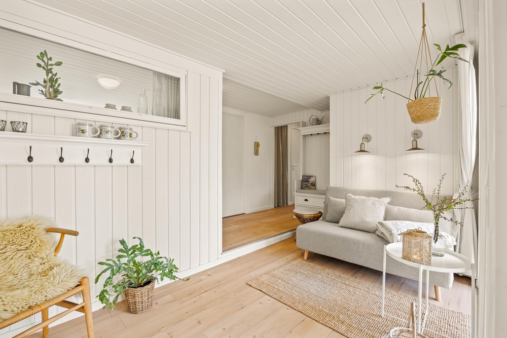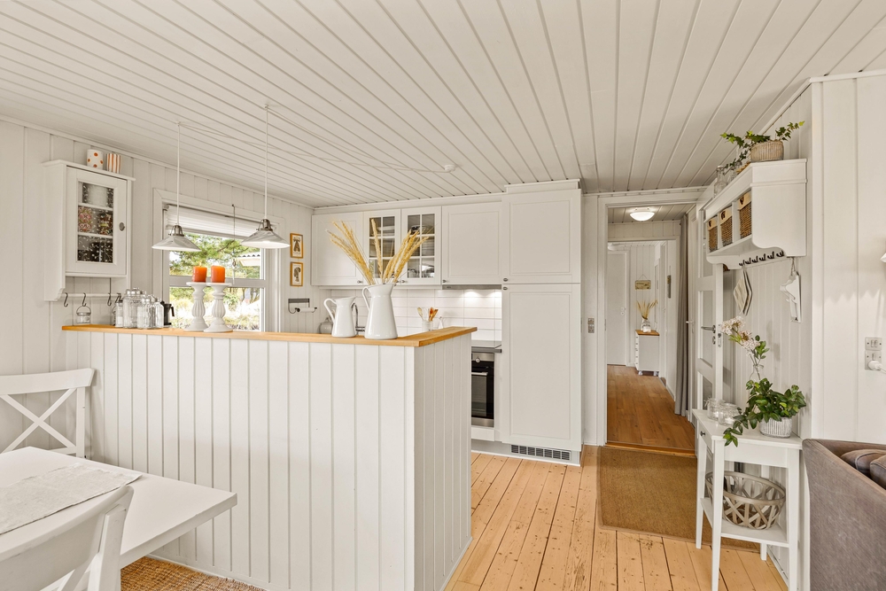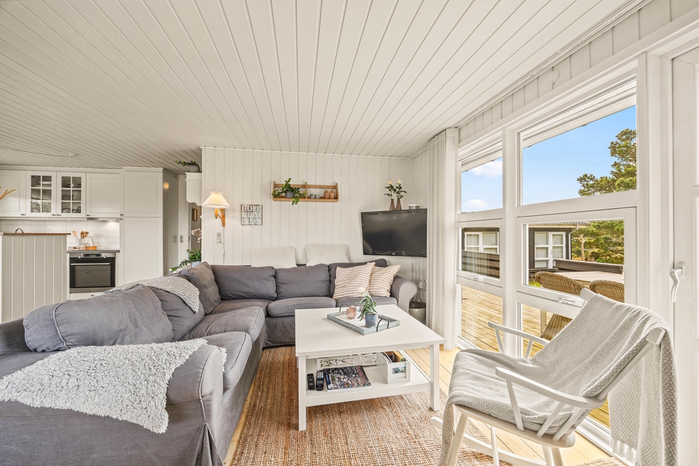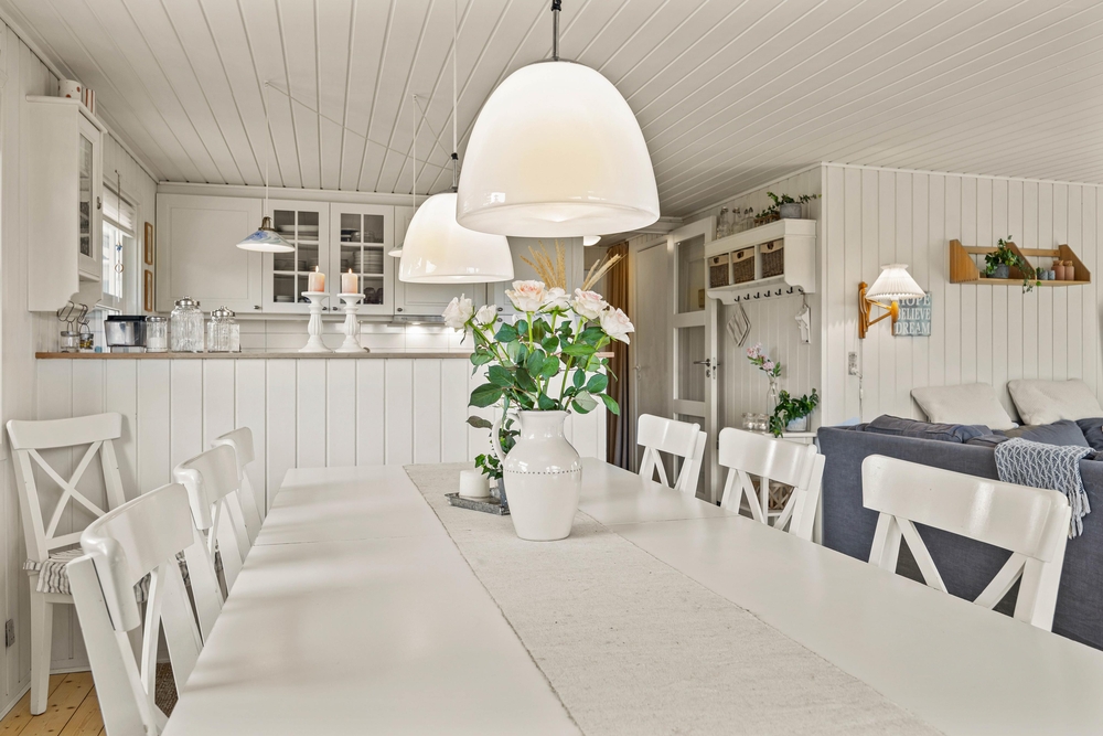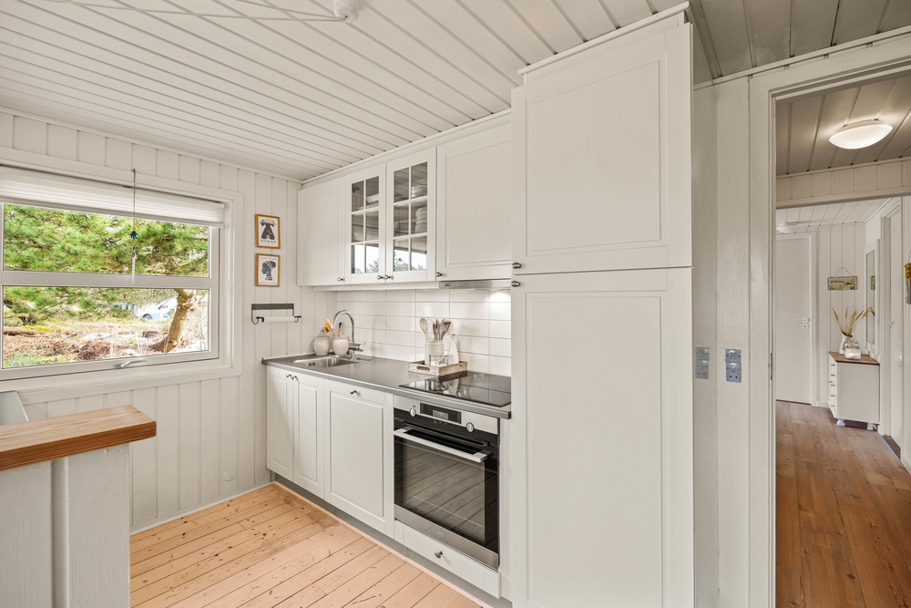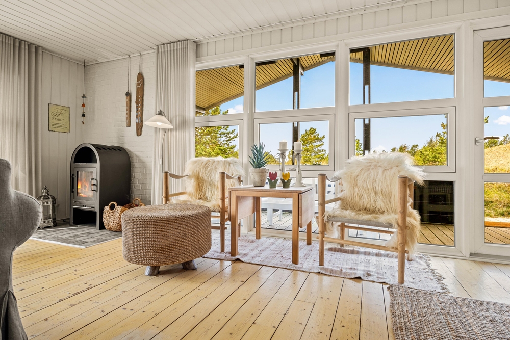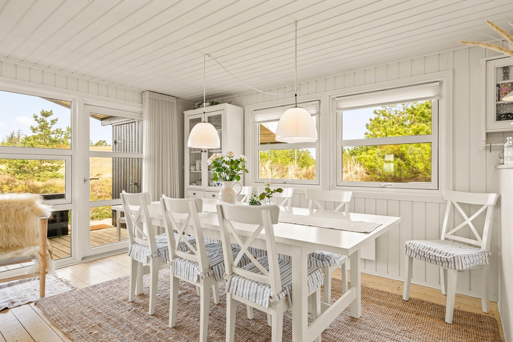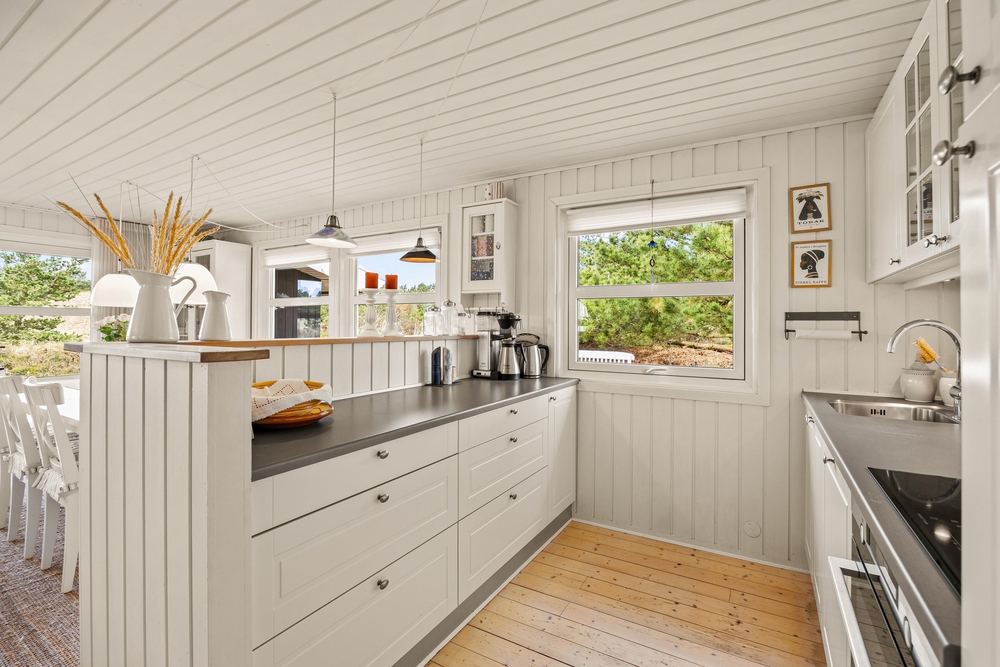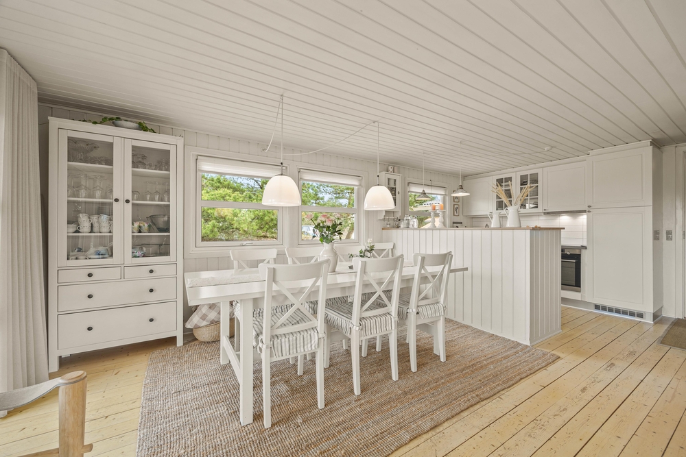 Sobald ihr in dieses schöne Ferienhaus tretet, werdet ihr die gemütlichen Stimmung des Ferienhauses spüren und dann kann euer Urlaub beginnen. Das Herzstück des Sommerhauses ist der offene Wohnraum, der mit seinem hellen Boden und den weiß gestrichenen Wänden zum Entspannen einlädt. Die Küche ist offen mit dem Essbereich und dem Wohnzimmer verbunden, so dass ihr viele schöne Stunden im Rahmen der Familie verbringen könnt. Die großen Fenster sorgen für einen tollen Lichteinfall und die Wärme des Kamins für das Extra an Gemütlichkeit.
