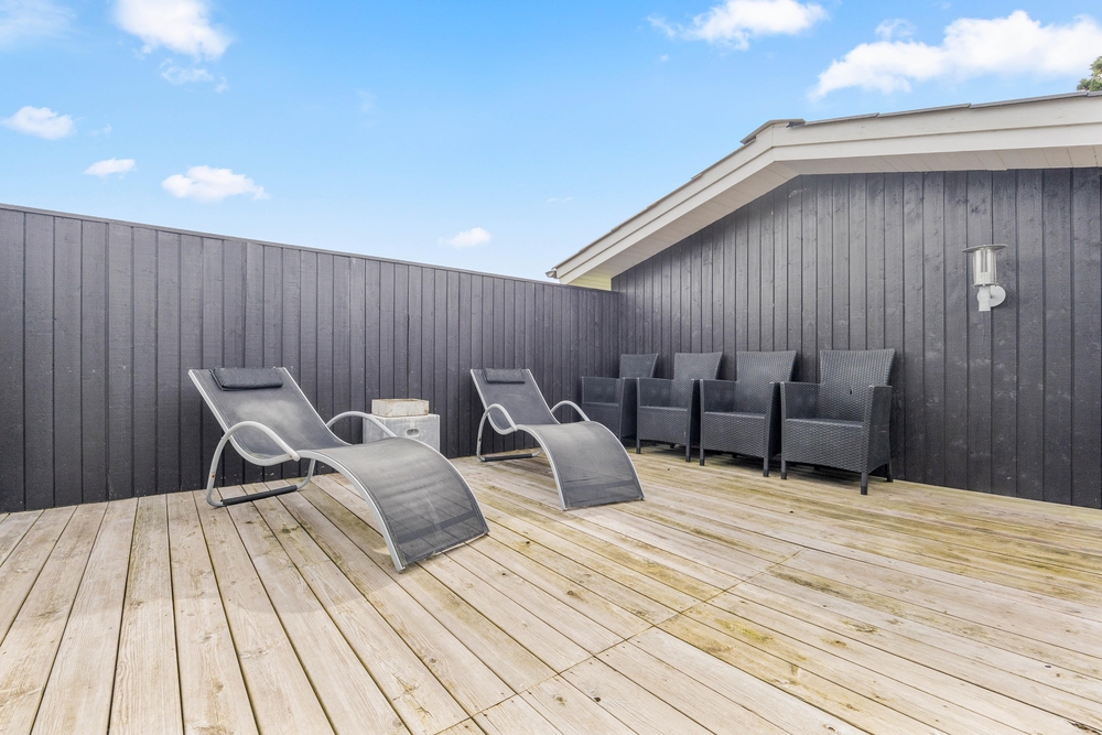 Vom Wohnzimmer aus tretet ihr direkt auf die Terrasse. Morgens könnt ihr mit einer frischen Tasse Kaffee auf die große Holzterrasse gehen und die frische Luft am frühen Morgen sowie die ersten Sonnenstrahlen genießen. Der Außenbereich besticht durch die schöne Gestaltung, es gibt mehrere Terrassenbereich, die abgeschirmt sind.