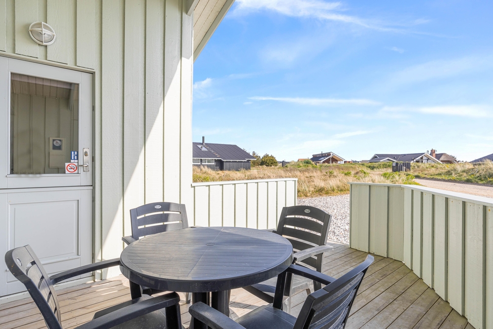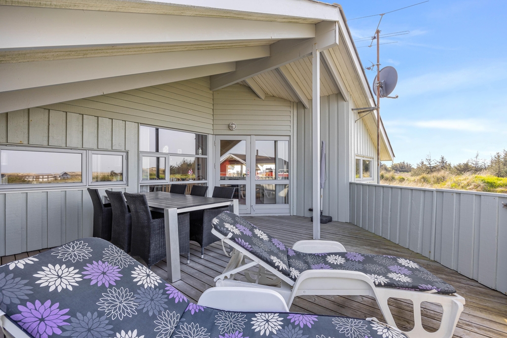 Vom Wohnbereich aus gelangt ihr auf die geschlossen und teils überdachte Terrasse. Hier könnt ihr eure kleinen Kinder auch mal laufen lassen, ohne dass sie direkt ohne euch das großzügige Naturgrundstück erkunden. Bequeme Gartenmöbel und Sonnenliegen laden zum Entspannen ein. Lasst bei einem leckeren Getränk die Seele baumeln und genießt die Meeresluft, während eure Kinder schaukeln oder Wikingerschach spielen.