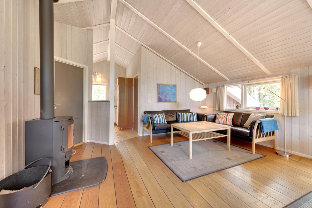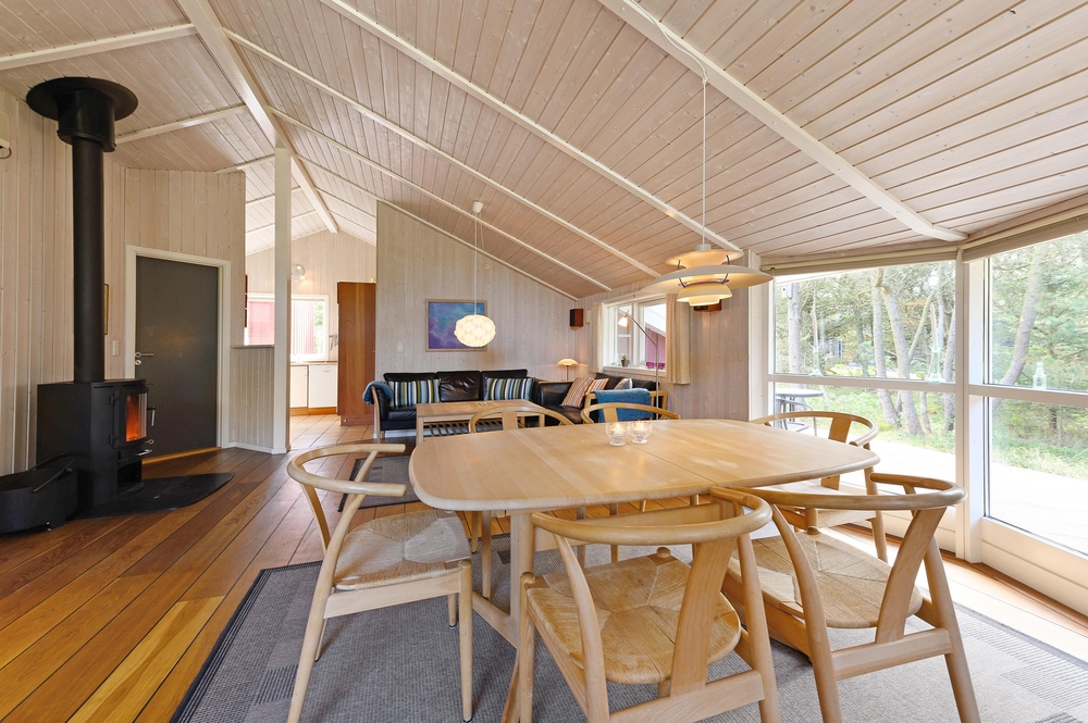 Sammelpunkt des Hauses ist der Wohn- und Essbereich mit der sich anschließenden Terrasse. Hier könnt ihr gesellige Spieleabende vor dem Kaminofen verbringen oder ihr zieht euch in die Fernsehecke zurück und schaut eure Lieblingsserie oder eine DVD an. Die hohen Holzdecken und der Holzfußboden geben dem Haus eine wohlige Atmosphäre.