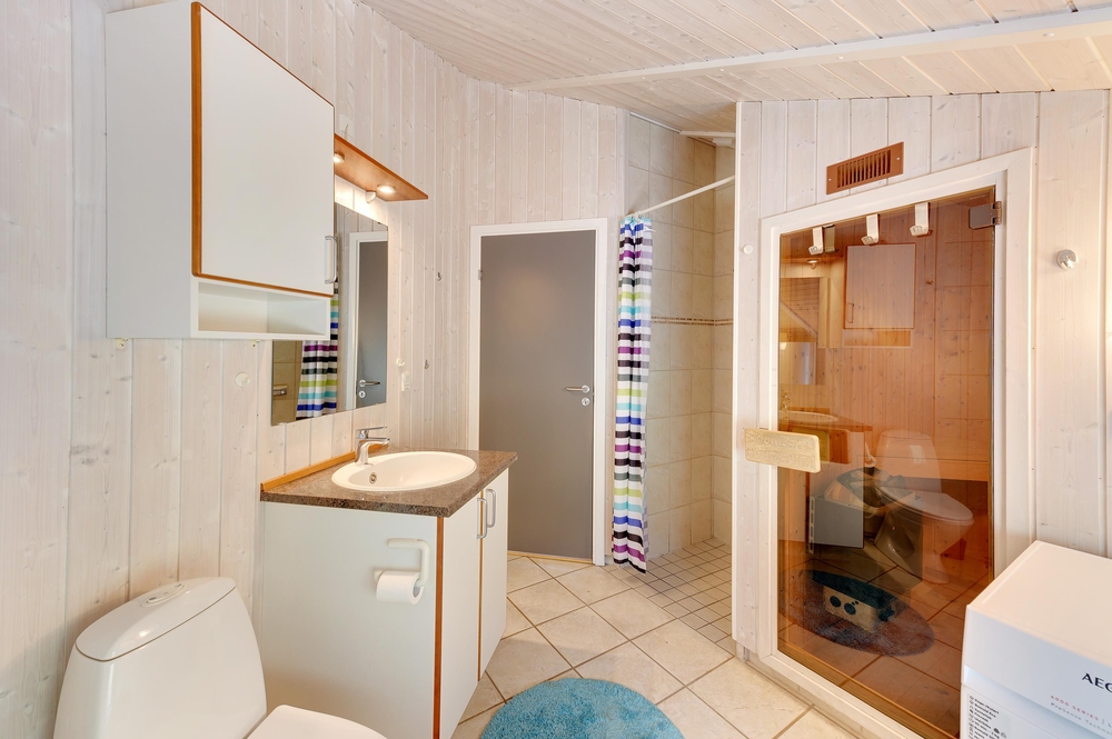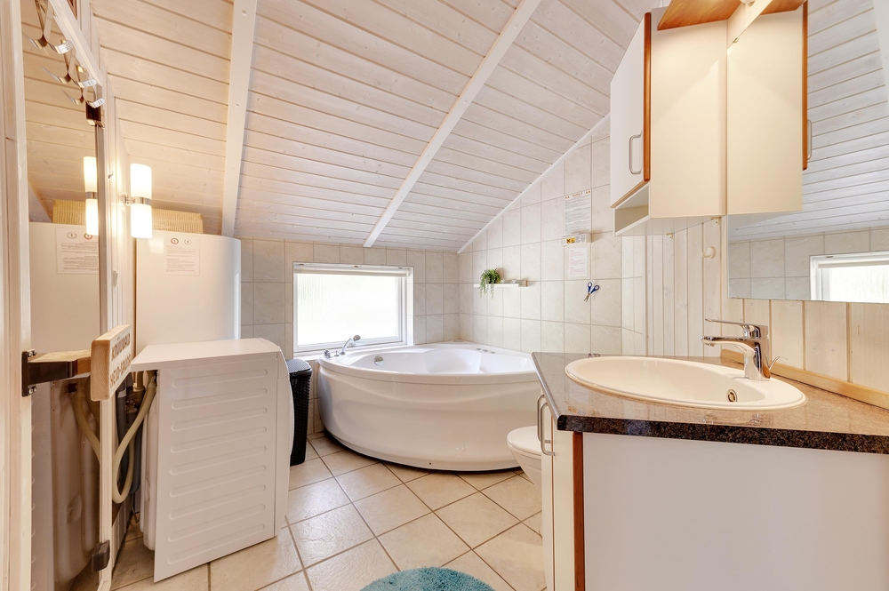 Das Badezimmer ist auch wie der Rest des Hauses hell und freundlich gestaltet und ist der ideale Rückzugsort, wenn ihr euch nach einem langen Tag in der Sauna oder im Whirlpool entspannen wollt. Zudem verfügt das Badezimmer auch über eine Waschmaschine.