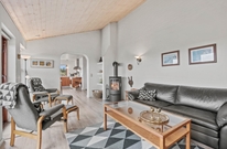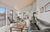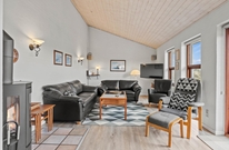 Die ansprechend möblierte Küche ist das Zentrum des Ferienhauses und der gemütliche Aufenthaltsbereich direkt nebenan lädt zum Entspannen vor dem knisternden Kamin oder dem Fernseher ein. Die hohen Decken und großen Fenster sorgen hier für eine angenehme Atmosphäre.