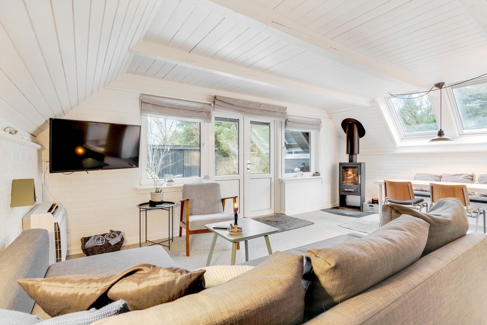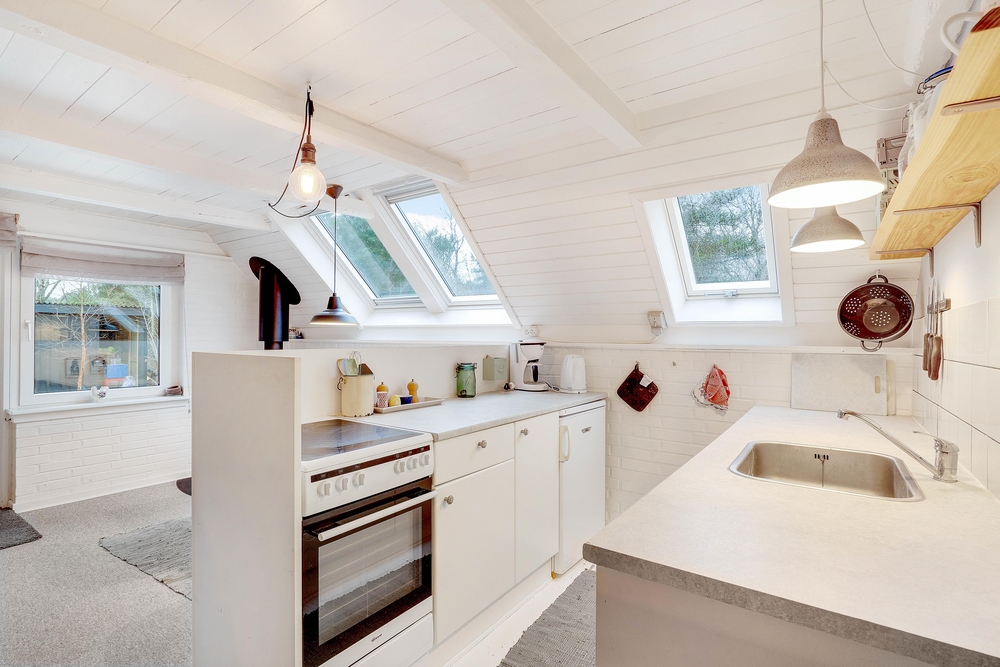 In diesem Ferienhaus ist Hygge angesagt. Die einladende und einfache Einrichtung in gedämpften Farben schaffen genau die richtige Urlaubsstimmung, während der Kaminofen auch an kalten Wintertagen für eine angenehme Wärme sorgt. Die Wohnküche und das Wohnzimmer sind verbunden und bilden das Herz des Ferienhauses. Hier kann die ganze Familie beisammen sein und sich zu leckeren Mahlzeiten, gemütlichen Spielabenden oder ruhige Entspannung auf dem Sofa versammeln. Die Spülmaschine erledigt den lästigen Abwasch.