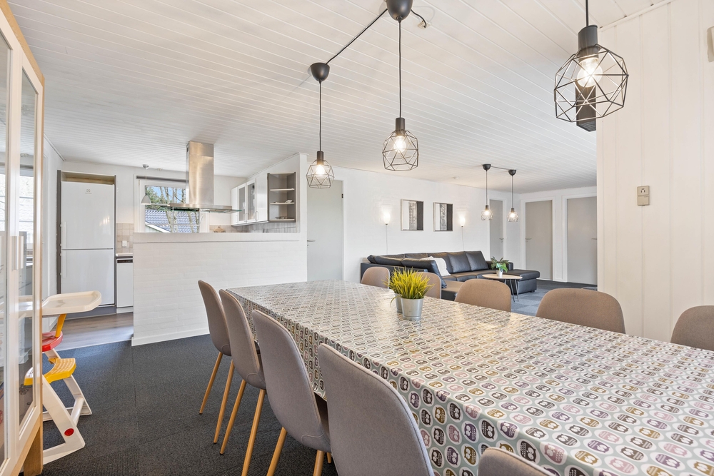 Das Herzstück des Ferienhauses im Birkelunden 32 ist das geräumige Wohnzimmer, das mit einem gemütlichen Kaminofen eine einladende Atmosphäre schafft. Hier könnt ihr euch nach einem ereignisreichen Tag entspannen und den Blick auf den Garten genießen oder euch einfach vor dem prasselnden Feuer einkuscheln. Die Sitzmöbel laden zum Verweilen ein, während große Fenster viel natürliches Licht hereinlassen. Die moderne Küche ist gut ausgestattet und verfügt über alles, was ihr für die Zubereitung leckerer Mahlzeiten benötigt. Mit der Spülmaschine geht der Abwasch schnell von der Hand, sodass euch mehr Zeit für die angenehmen Dinge bleibt. Der offene Grundriss ermöglicht es euch zudem, eure Kochkünste zu entfalten, während ihr mit Familie und Freunden plaudert, die sich im angrenzenden Essbereich oder Wohnzimmer aufhalten.