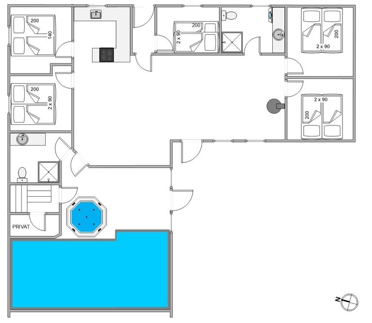 Euer Ferienhaus verfügt über 5 Schlafzimmer, die Platz für bis zu 10 Personen bieten. Insgesamt 3 der Schlafzimmer sind mit einem komfortablen Doppelbett ausgestattet, während das 5. Schlafzimmer über 1 Etagenbett verfügt. Mit 2 modernen Badezimmern ist das Ferienhaus bestens ausgestattet. Ein Highlight ist das Badezimmer mit Fußbodenheizung und einem Standwasser-Whirlpool, der Entspannung pur verspricht.