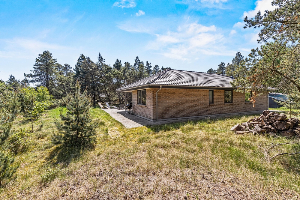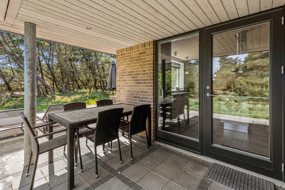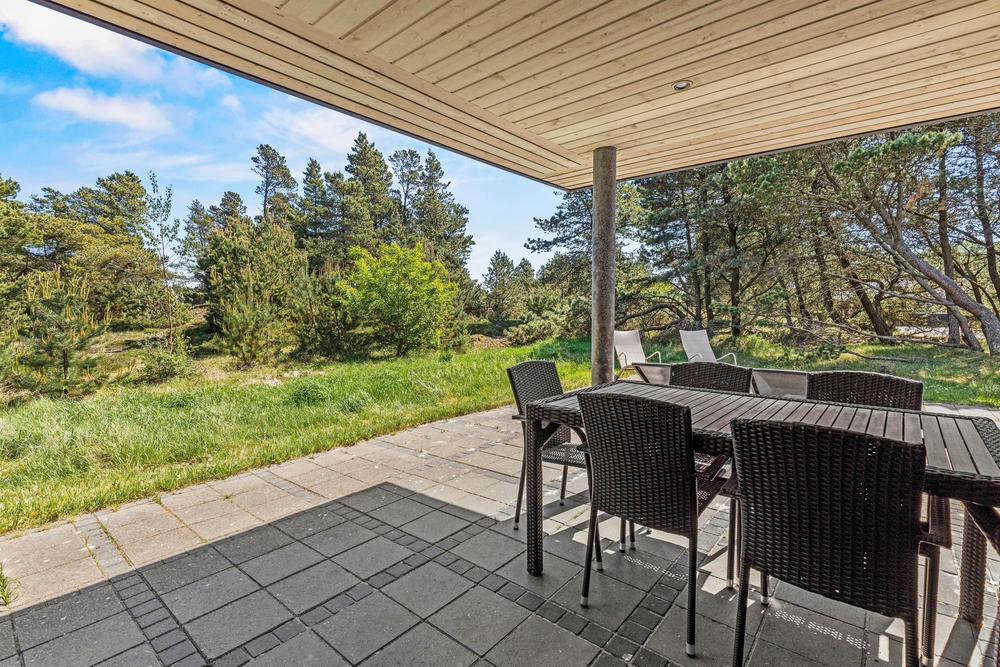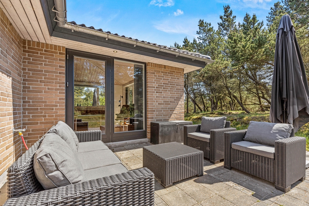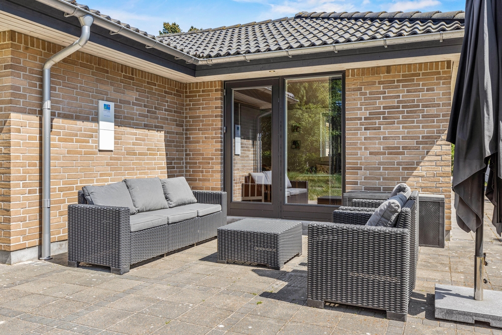 Im Außenbereich könnt Ihr die dänische Natur in vollen Zügen genießen. Während die Kinder draußen spielen, könnt Ihr auf der teilweise überdachten Terrasse die Füße in den Liegestühlen hochlegen.