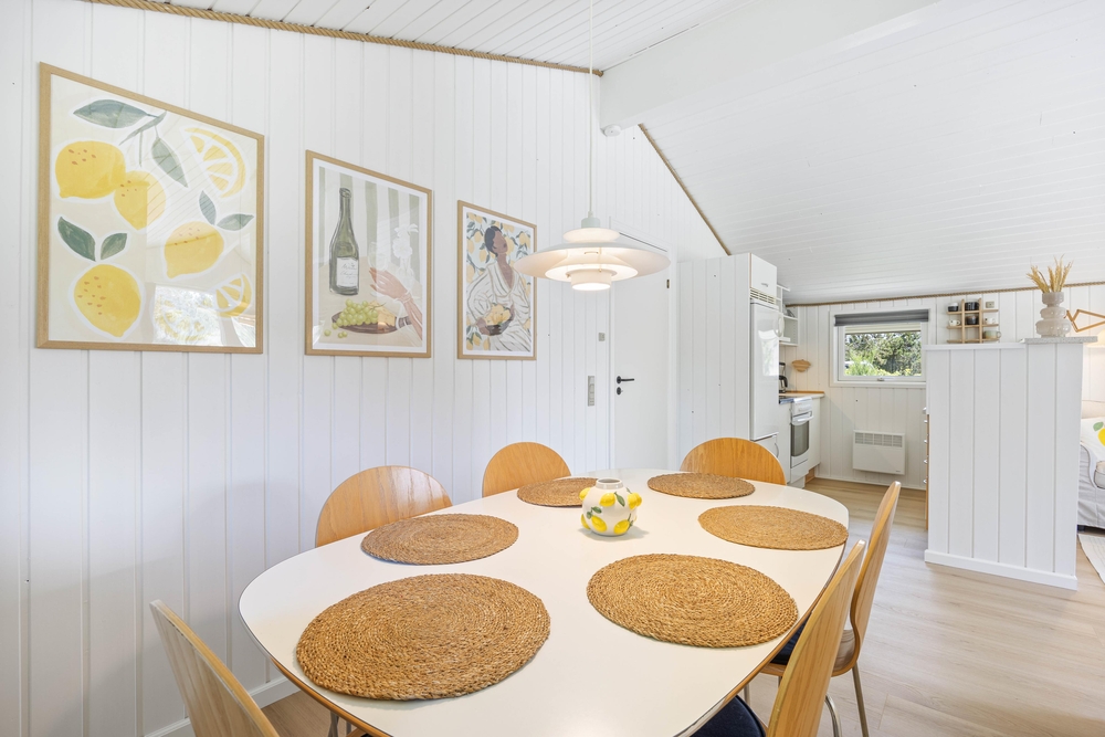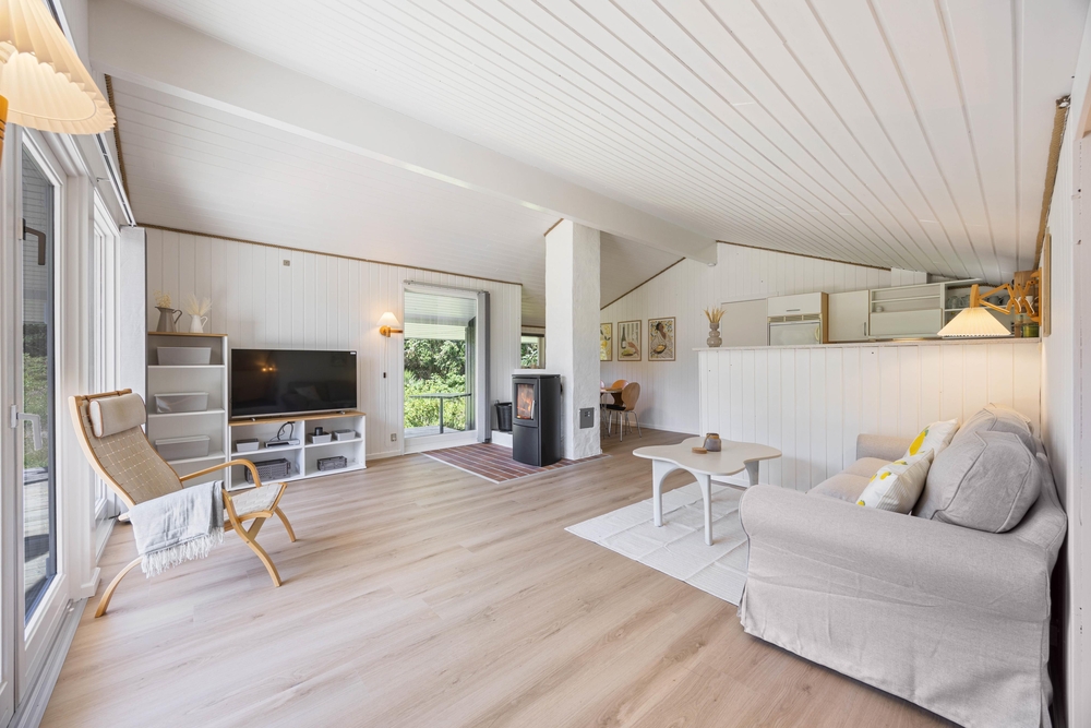 Das typisch skandinavische Ferienhaus ist gemütlich eingerichtet und verfügt über alles, was für einen angenehmen Aufenthalt erforderlich ist. Der offene Wohnbereich mit TV und Kamin lädt zum Entspannen ein, während die angrenzende, voll ausgestattete Küche, u. A. mit Spülmaschine, Mikrowelle sowie Kühlschrank mit Gefrierfach, zum gemeinsamen Kochen einlädt.