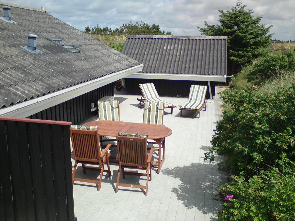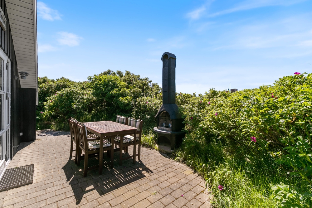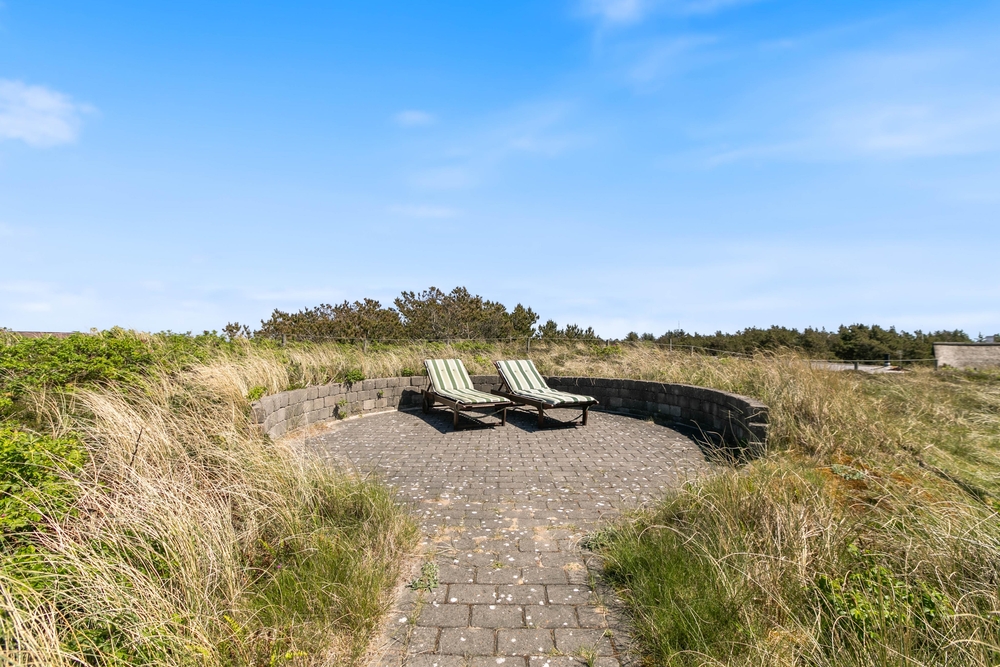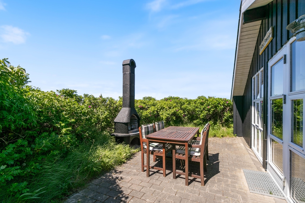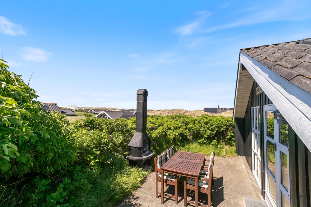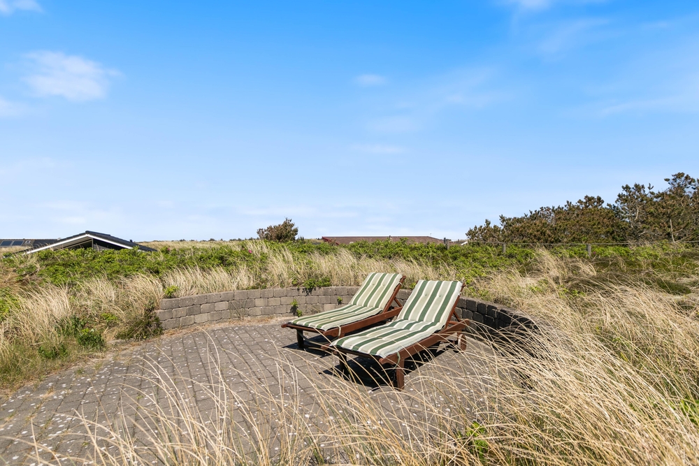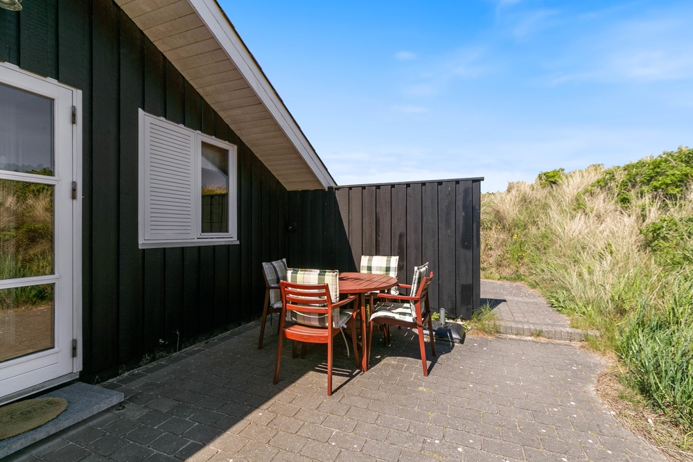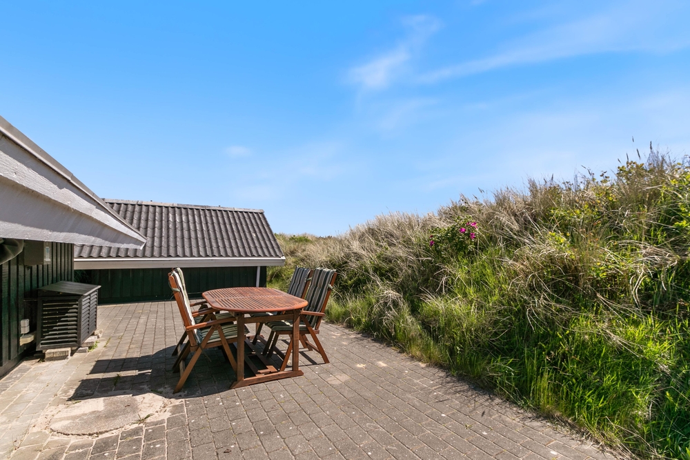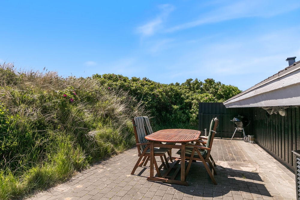 Um das Ferienhaus herum gibt es schöne windgeschüzte Stellen und die Terrasse wird von der Düne abgeschirmt. Der südliche Teil der Terrasse ist überdacht und es sind Gartenmöbeln mit Sitzkissen, Liegestühle und Grill vorhanden. Auf dem Dünengipfel gibt es ausserdem eine kleine Terrasse mit einer wunderschönen Aussicht über die Umgebung mit Dünen, Heide und Fjord.