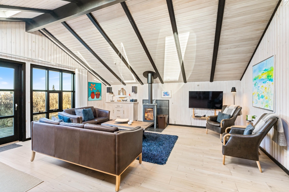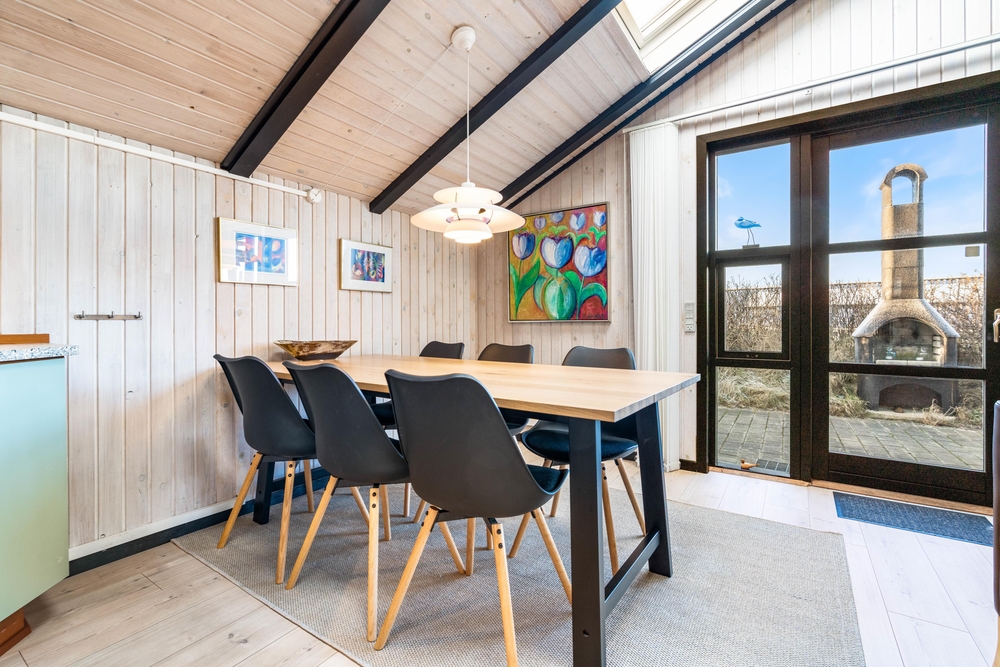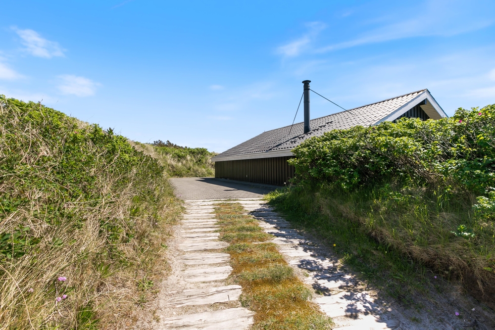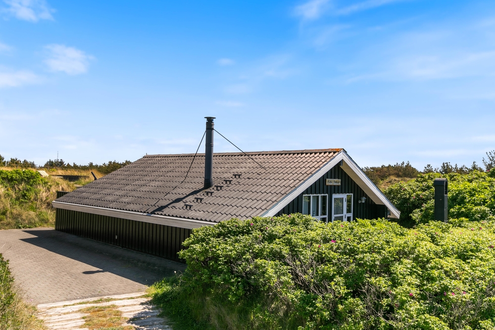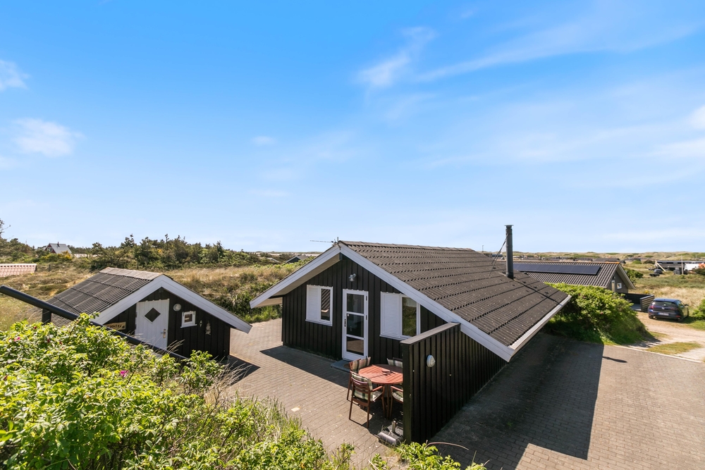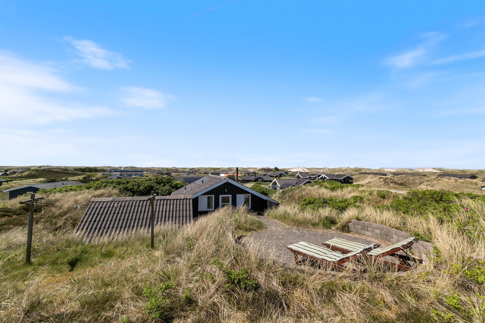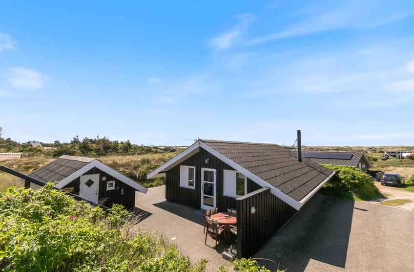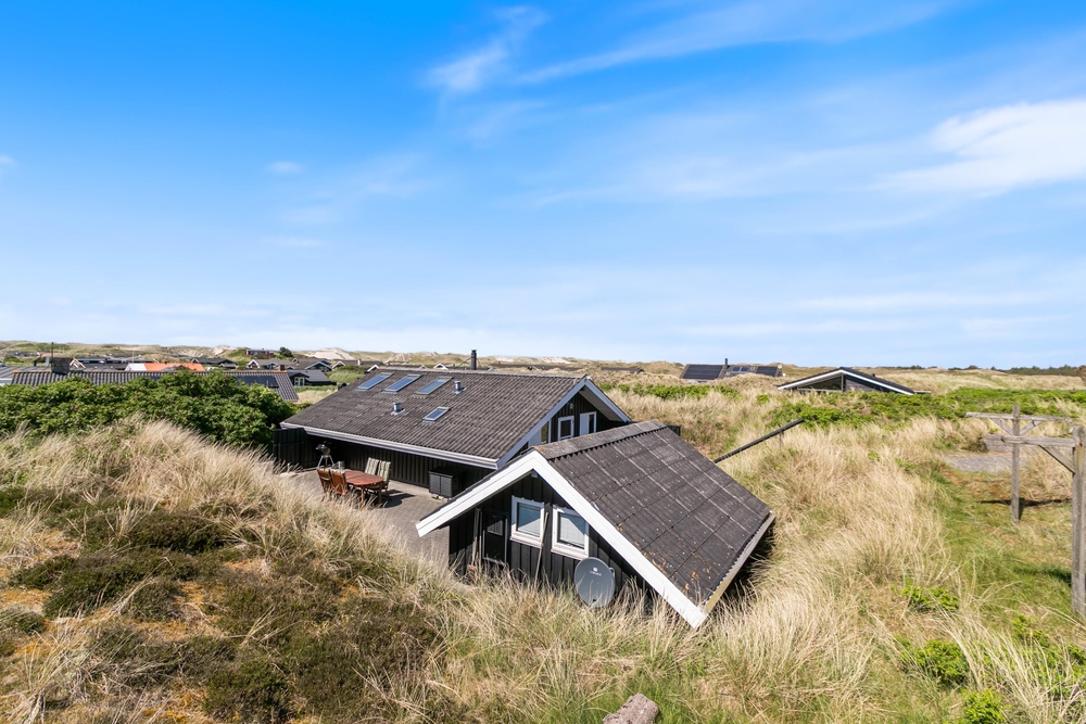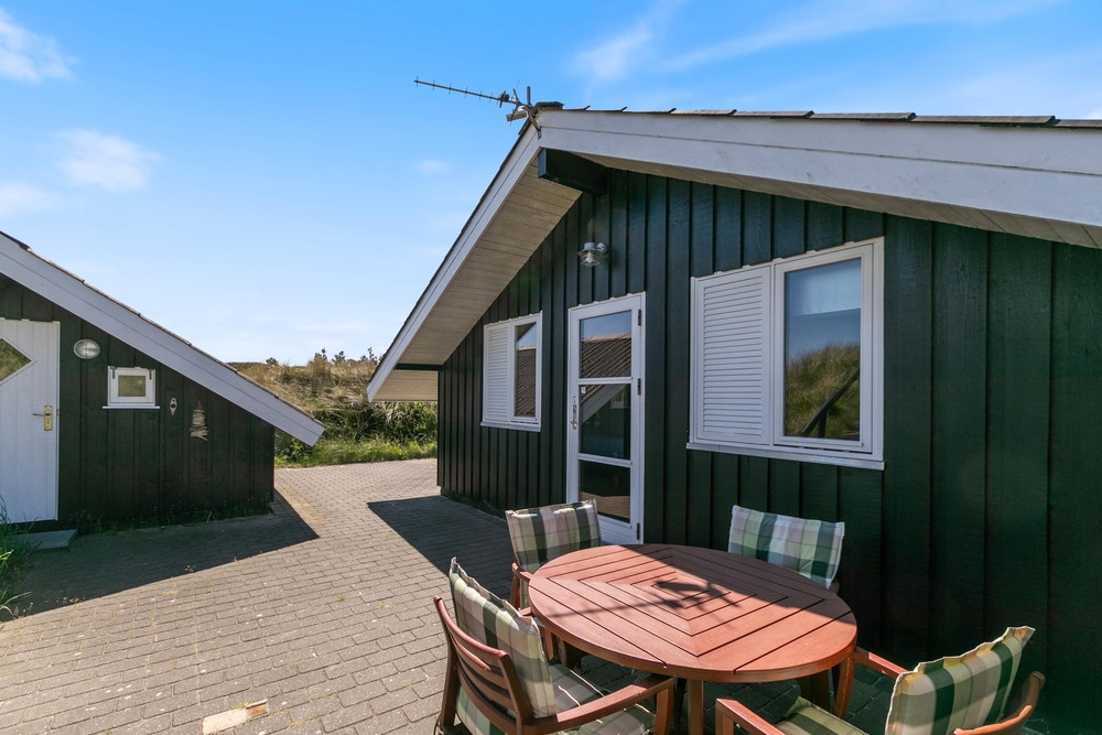 Um das Ferienhaus herum gibt es schöne windgeschüzte Stellen und die Terrasse wird von der Düne abgeschirmt. Der südliche Teil der Terrasse ist überdacht und es sind Gartenmöbeln mit Sitzkissen, Liegestühle und Grill vorhanden. Auf dem Dünengipfel gibt es ausserdem eine kleine Terrasse mit einer wunderschönen Aussicht über die Umgebung mit Dünen, Heide und Fjord.