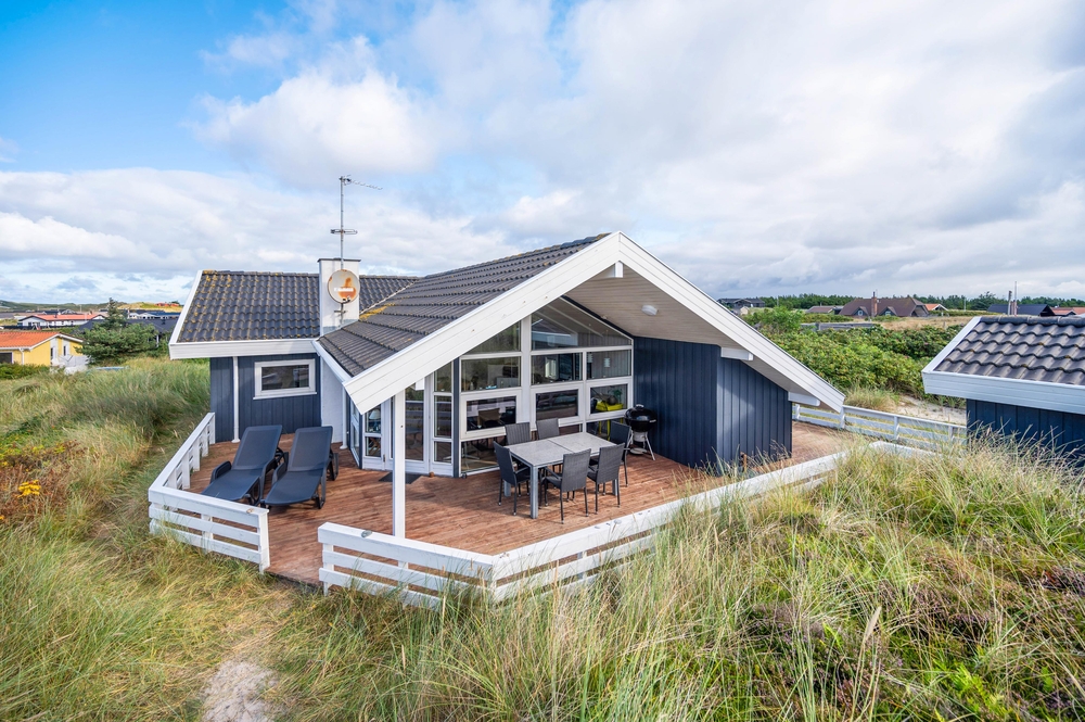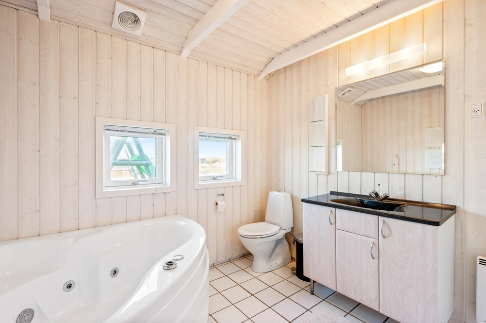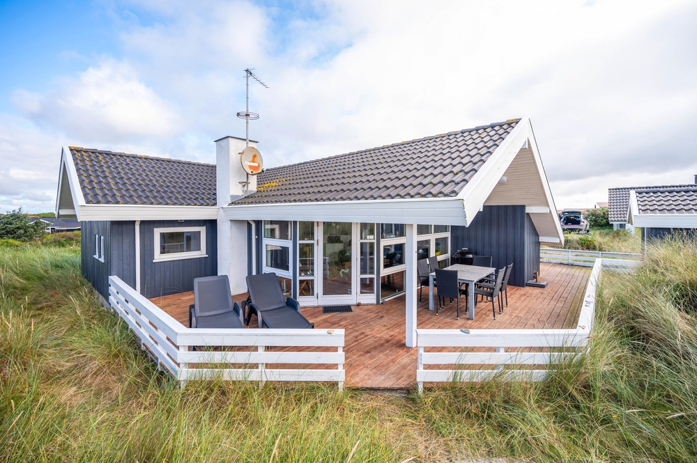 Mitten in einem der beliebtesten Ferienhausgebieten an der Westküste findet ihr im Bjerregårdsvej 233 dieses gemütliche Ferienhaus. Das Ferienhaus liegt auf einem kleinen Hügel nur 450 m vom breiten Nordseestrand entfernt und lädt nach einem ausgiebigen Strandspaziergang zu einem Saunagang mit anschließendem Bad im Whirlpool ein.