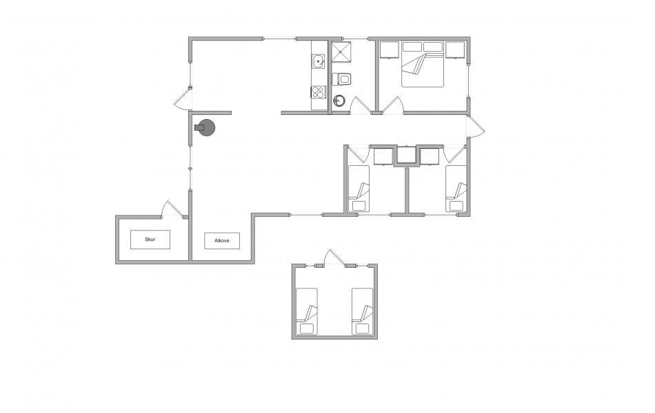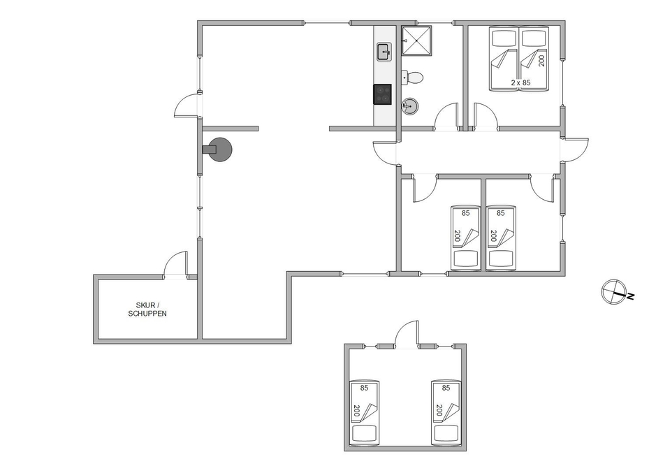Insgesamt gibt es vier Schlafräume im Bjerregårdsvej 263. Es stehen euch ein Schlafzimmer mit Doppelbett, zwei Schlafzimmer mit je einem Einzelbett und ein Anbau mit zwei Einzelbetten zur Verfügung. So könnt ihr euch gut aufteilen und einen ruhigen Schlaf genießen.