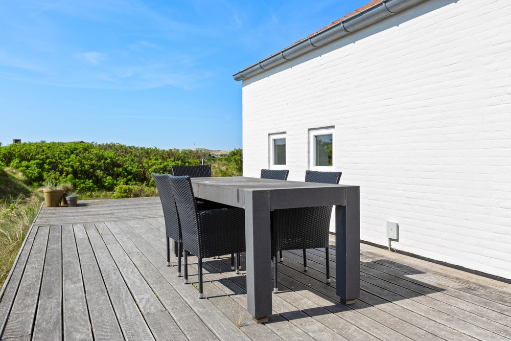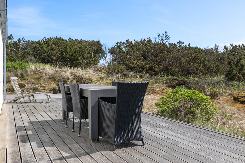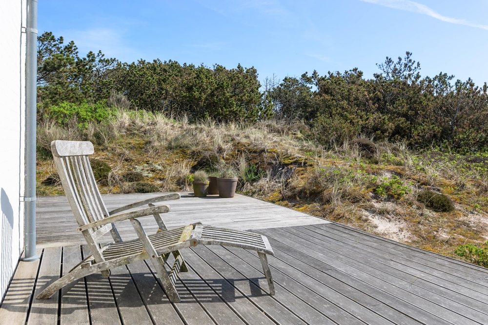Auf drei Seiten eures Ferienhauses befindet sich eine offen gestaltete Holzterrasse, auf der ihr die Sonnenstunden genießen könnt. Je nach Windrichtung und Sonnenstand könnt ihr so um das Ferienhaus mitwandern. Zum Sonnenbaden stehen euch Gartenmöbel und Sonnenliegen zur Verfügung.