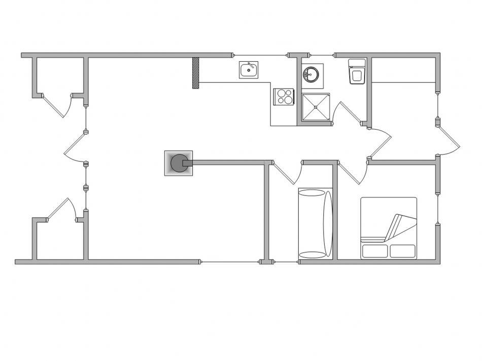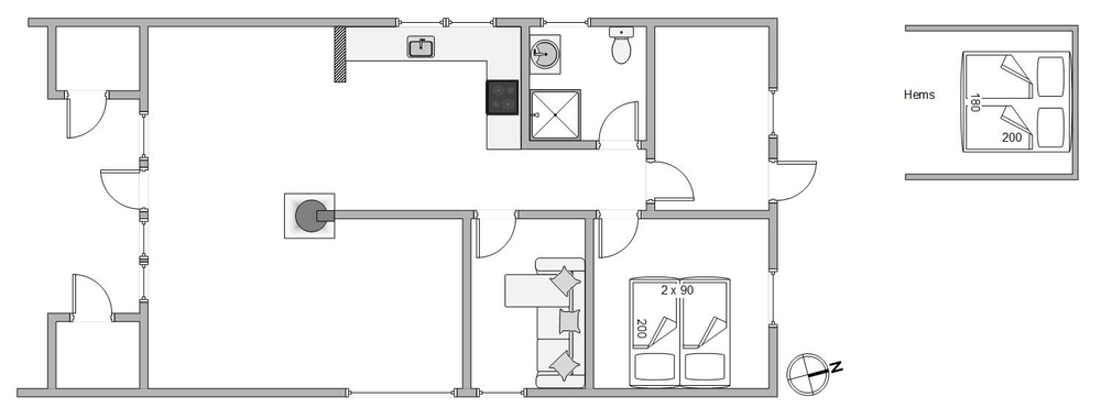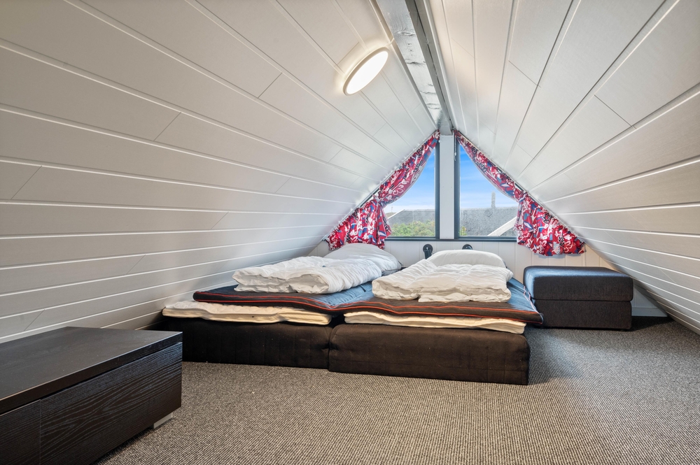 Es gibt ein Schlafzimmer mit einem Doppelbett, ein weiteres Zimmer mit einer Schlafcouch sowie zwei Schlafplätze auf dem Hängeboden. Das Badezimmer des Ferienhauses ist praktisch mit einer Fußbodenheizung ausgestattet.
